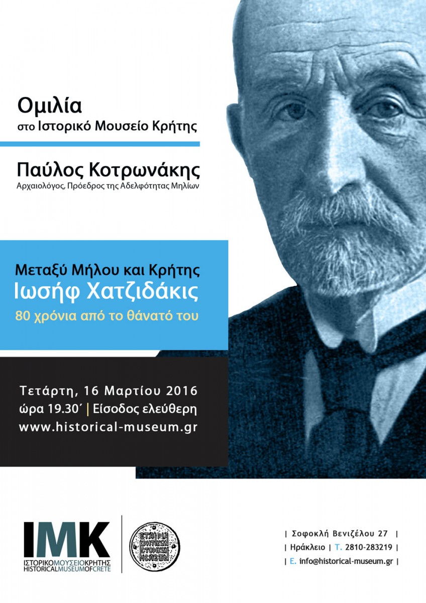 Η ομιλία «Μεταξύ Μήλου και Κρήτης: Ιωσήφ Χατζιδάκις, 80 χρόνια από τον θάνατό του» θα πραγματοποιηθεί την Τετάρτη 16 Μαρτίου 2016 και ώρα 19:30 στο αμφιθέατρο Γιάννη Περτσελάκη του Ιστορικού Μουσείου Κρήτης.