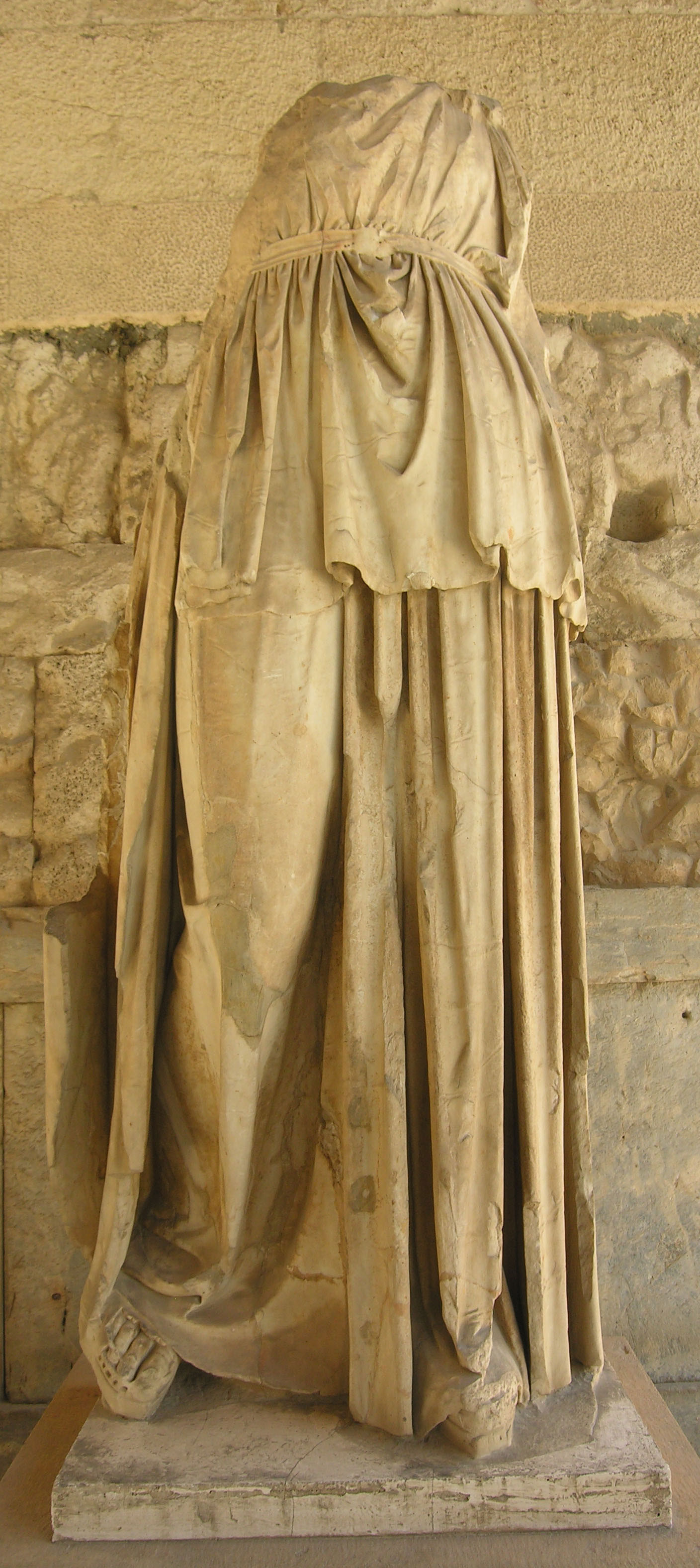 Ο.Π.: Κοιτάξτε, επειδή είναι πολύ περίεργα ντυμένη, φοράει ένα απόπτυγμα το οποίο είναι τριγωνικό, δηλαδή έχει φορέσει λοξά τον πέπλο. Ο πέπλος πάντα φοριέται κανονικά και είναι οριζόντιο το απόπτυγμα, εδώ έχει δημιουργηθεί ένα απόπτυγμα τριγωνικό. Και νομίζω ότι συμβολίζει μια Αθηνά η οποία σήκωνε το απόπτυγμα για να βάλει μέσα κάτι. Δεν ξέρω αν έβαζε μέσα ένα παιδί, τον Εριχθόνιο… Το λέω επειδή υπάρχει μια Αθηνά στο Λούβρο, ρωμαϊκό αντίγραφο κλασικού έργου, πιο παλιού όμως από την Αθηνά του Πειραιά, η οποία κρατάει στην αγκαλιά της ένα μωρό που είναι ο Εριχθόνιος. Δεν είναι δικό της παιδί, είναι του Ηφαίστου, το οποίο ανέλαβε να μεγαλώσει η Αθηνά ως τροφός. Και πιστεύω ότι αυτό το τριγωνικό απόπτυγμα είναι μια ανάμνηση αυτού του ρόλου που είχε η Αθηνά ως τροφός του Εριχθονίου. Αυτό εννοώ.