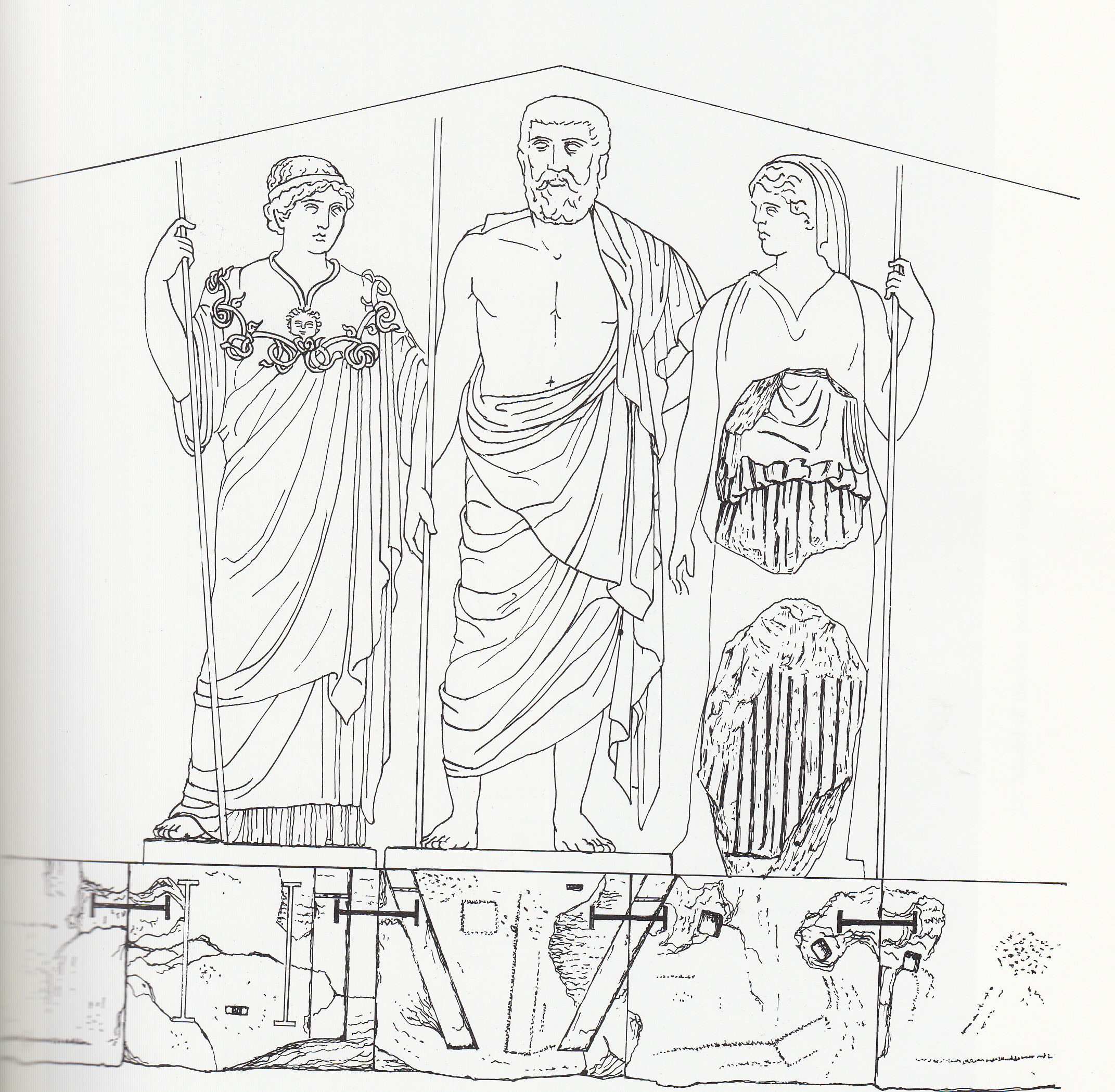 Ο.Π.: Γίνεται, τα ίχνη αυτά δεν είναι αρκετά για να καταλήξουμε σε οριστικό συμπέρασμα. Κοιτάξτε, στο οριζόντιο γείσο, που στην πραγματικότητα είναι το πάτωμα στο οποίο πατούσαν οι μορφές, βλέπουμε γομφώσεις, δηλαδή τρύπες, από σιδερένιους γόμφους, είναι σαν καρφιά αλλά πολύ μεγάλα, ορθογώνιας διατομής, που έμπαιναν ανάμεσα στο άγαλμα και στο πάτωμα. Το άγαλμα στηριζόταν με τους γόμφους. Κάτω από τα αγάλματα βάζανε φύλλα μολύβδου, και ακόμα το κάνουν αυτό, και το κάνανε πάρα πολύ στη συντήρηση και αναστήλωση των ναών της Ακροπόλεως, ανάμεσα στους λίθους τους μαρμάρινους βάζουν φύλλα μολύβδου για να εμποδίζουν την υγρασία. Τα βάζανε και κάτω από τα αγάλματα που στεκόντουσαν πάνω στο αέτωμα του Παρθενώνα. Με αυτά όμως, τι έγινε; Όταν στέκεται το άγαλμα πάνω σ’ ένα πολύ λεπτό φύλλο μολύβδου, όταν βρέχει, το νερό που μπαίνει κάτω από την πλίνθο ή τα πόδια του αγάλματος διαβρώνει το πάτωμα αλλά το σημείο στο οποίο ακουμπάει ο μόλυβδος δεν διαβρώνεται. Άρα δημιουργείται ένα έξαρμα, το οποίο μας δείχνει πού ακουμπούσε ο μόλυβδος κάτω από το άγαλμα. Άρα πάνω από το έξαρμα αυτό υπήρχε άγαλμα. Καταλάβατε ποιο είναι το θέμα; Όταν μετά το έξαρμα υπάρχει κενό και παρακάτω βλέπουμε ένα άλλο έξαρμα σημαίνει ότι εδώ είναι ένα άγαλμα κι εκεί είναι άλλο άγαλμα. Αυτό βοηθάει πάρα πολύ να καταλάβουμε πόσα αγάλματα και πού ήταν στημένα – κι από τις γομφώσεις, που είναι τρύπες.