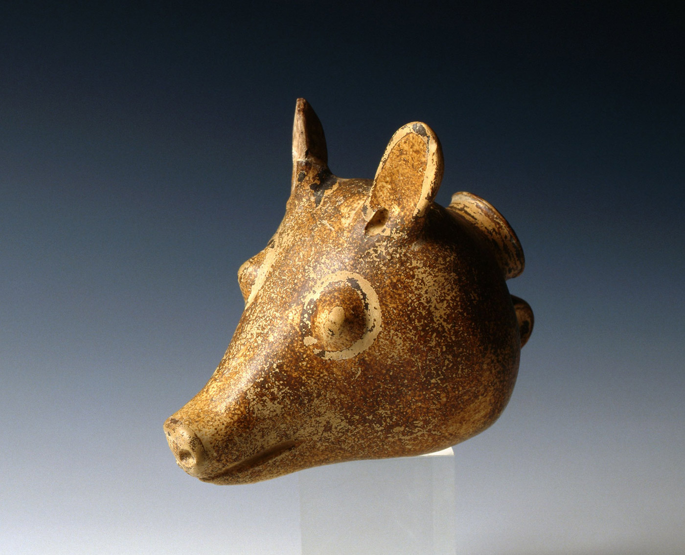 Τα αγγεία που βρέθηκαν πάνω στο θρανίο ήταν κυρίως άβαφες κύλικες, χρονολογούμενες στις ΥΕ ΙΙΙΑ2-ΙΙΙΒ2 περιόδους (14ος-13ος αι. π.Χ.). Παρόμοιες απλές κύλικες προερχόμενες από λατρευτικούς χώρους θεωρείται ότι χρησίμευαν στην τελετουργία των σπονδών, κατά την οποία κάποιος έχυνε ένα μέρος του υγρού στη γη για να προσφερθεί στη θεότητα και κατόπιν έπινε το υπόλοιπο, ως ένα είδος κοινωνίας με το θείο (σημ. 15). Σε μια άλλη ομάδα αγγείων, που βρέθηκαν στη νοτιοδυτική γωνία του δωματίου, συμπεριλαμβανόταν ένα εξαιρετικής τέχνης ρυτό σε σχήμα κεφαλής χοιριδίου (εικ. 10). Ως προς την ταύτιση του ζώου, πρέπει να σημειώσουμε ότι τα αυτιά των χοιριδίων είναι μικρά και όρθια, όπως εκείνα του ρυτού, και όχι πλατιά και αναδιπλωμένα, όπως στους μεγαλύτερους χοίρους. Η παρουσία αυτού του ρυτού στο Δωμάτιο Α ίσως δεν είναι άσχετη με το γεγονός ότι τα περισσότερα από τα οστά ζώων που βρέθηκαν εδώ ανήκαν σε νεαρούς ή νεογέννητους χοίρους. Τα ρυτά σε σχήμα κεφαλής ζώου θεωρείται ότι χρησίμευαν για αιματηρές σπονδές (σημ. 16) και δεν αποκλείεται με αυτό το αγγείο να προσφερόταν στη θεότητα το αίμα των θυσιασμένων χοιριδίων, μια τελετουργία που ενδεχομένως αποσκοπούσε στην ευφορία της γης (σημ. 17). Η αντίληψη ότι το ράντισμα του χώματος με αίμα συντελεί στην ανάπτυξη των φυτών μαρτυρείται στα Μέθανα πολύ αργότερα από τον Παυσανία (2.34.2), ο οποίος περιγράφει μια μαγική τελετή με το αίμα ενός άσπρου πετεινού που γινόταν για να προστατευθούν τα αμπέλια από τον λίβα που τα ξέραινε.