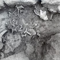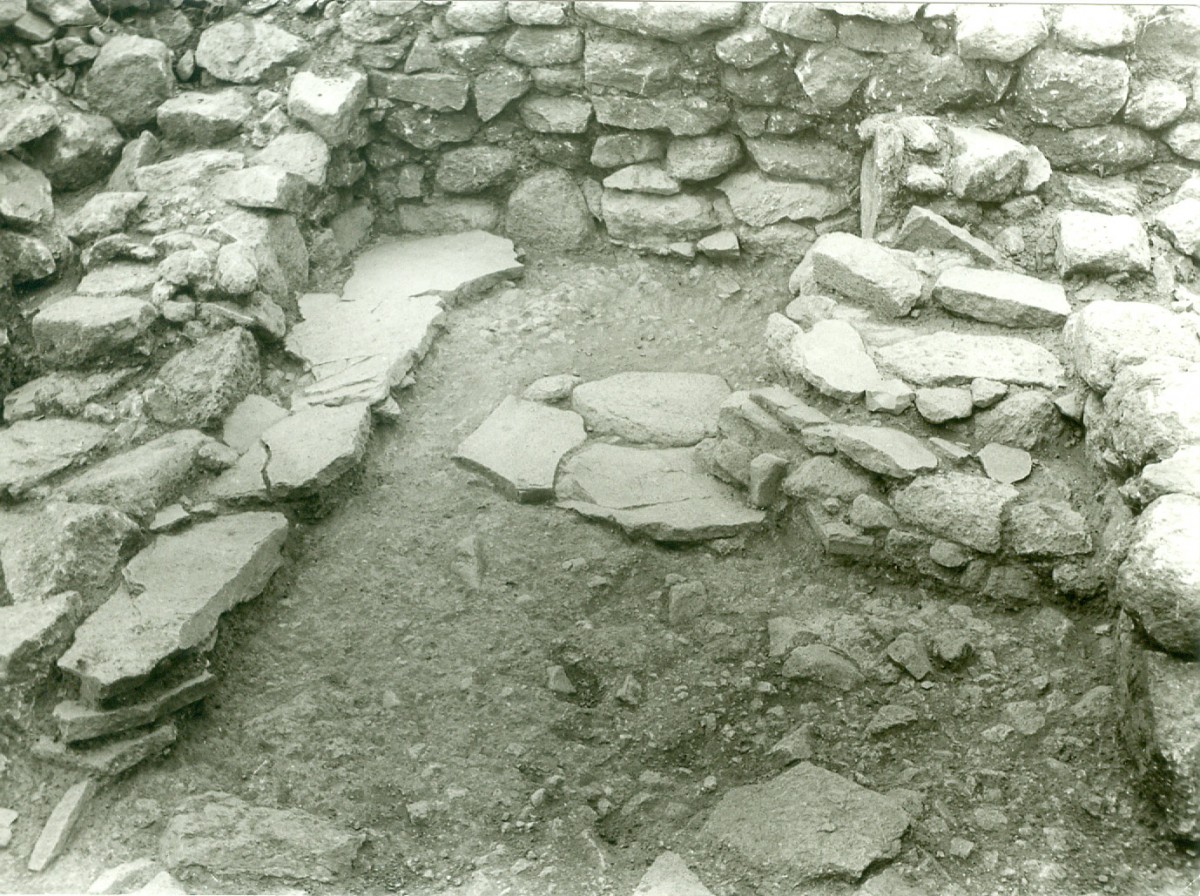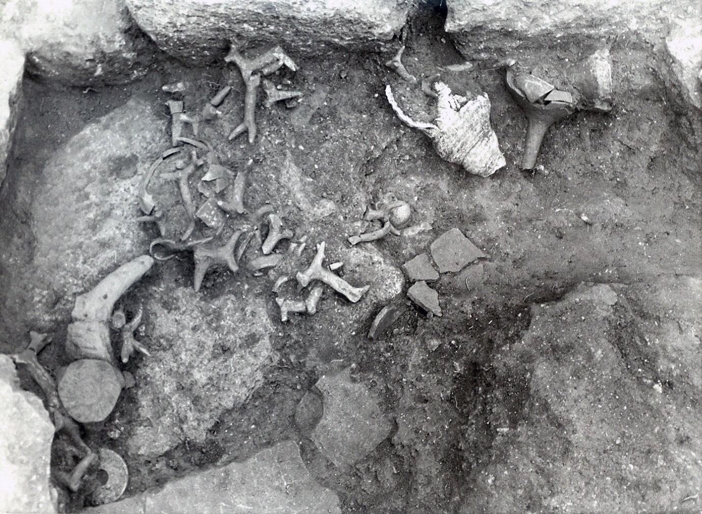Στο εσωτερικό της εστίας υπήρχε ένα παχύ στρώμα στάχτης που περιείχε υπολείμματα από καμένα οστά ζώων. Στα ζωικά οστά από το Δωμάτιο Α επικρατούσαν τα νεαρά ή νεογέννητα χοιρίδια, με ποσοστό 53,7%, και ακολουθούσαν τα αιγοπρόβατα με ποσοστό περίπου 35%. Ένα μικρό ποσοστό, περίπου 5%, ανήκε σε πτηνά. Στα κατάλοιπα γευμάτων που συλλέχθηκαν στα γειτονικά δωμάτια πλεόναζαν τα αιγοπρόβατα μεγάλης ηλικίας, ενώ οι χοίροι, επίσης μεγάλης ηλικίας, αποτελούσαν ένα μικρό ποσοστό (σημ. 3).
