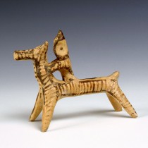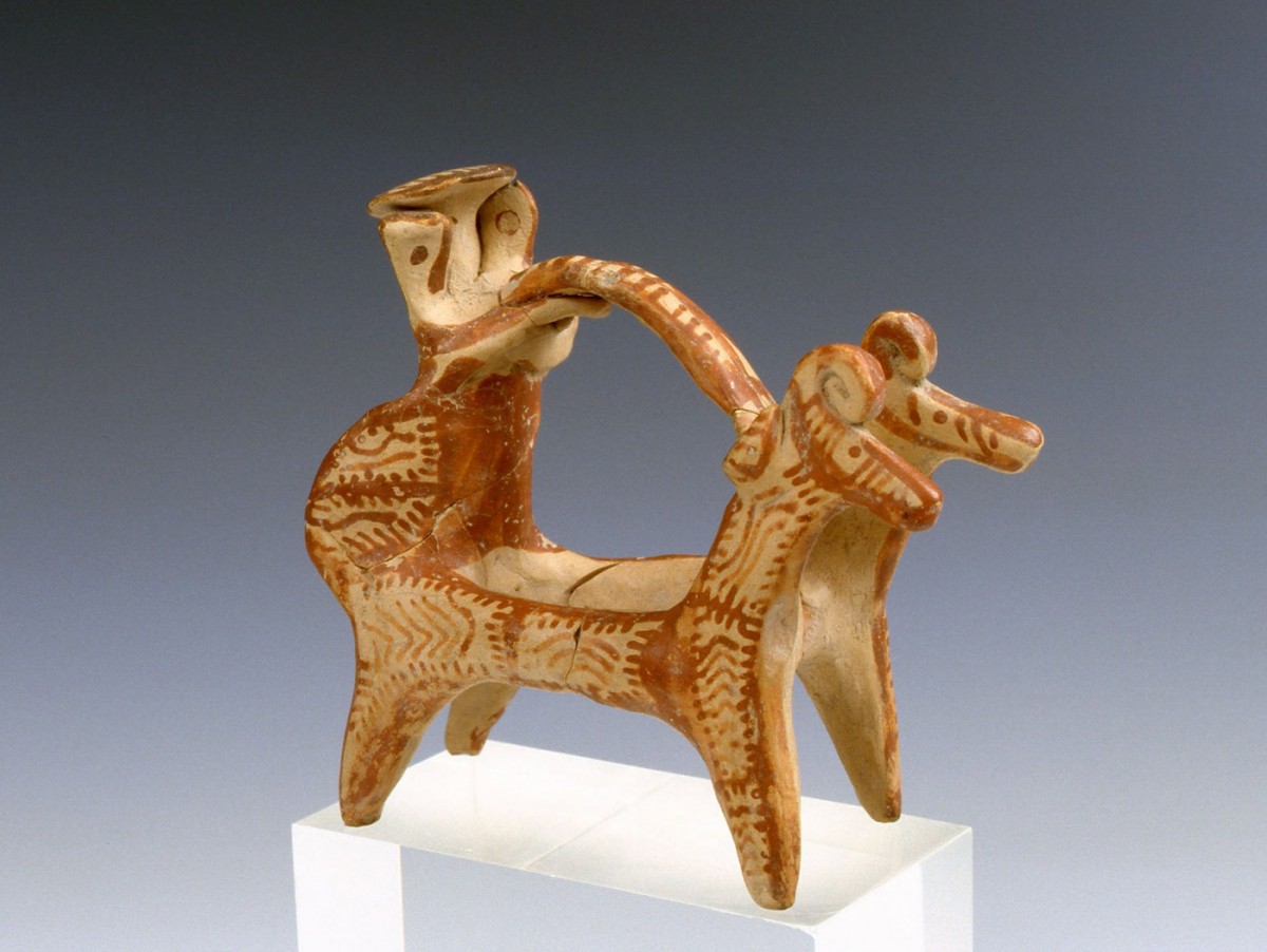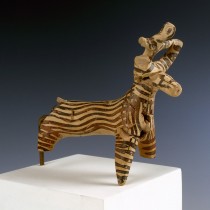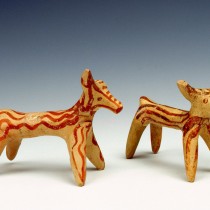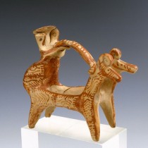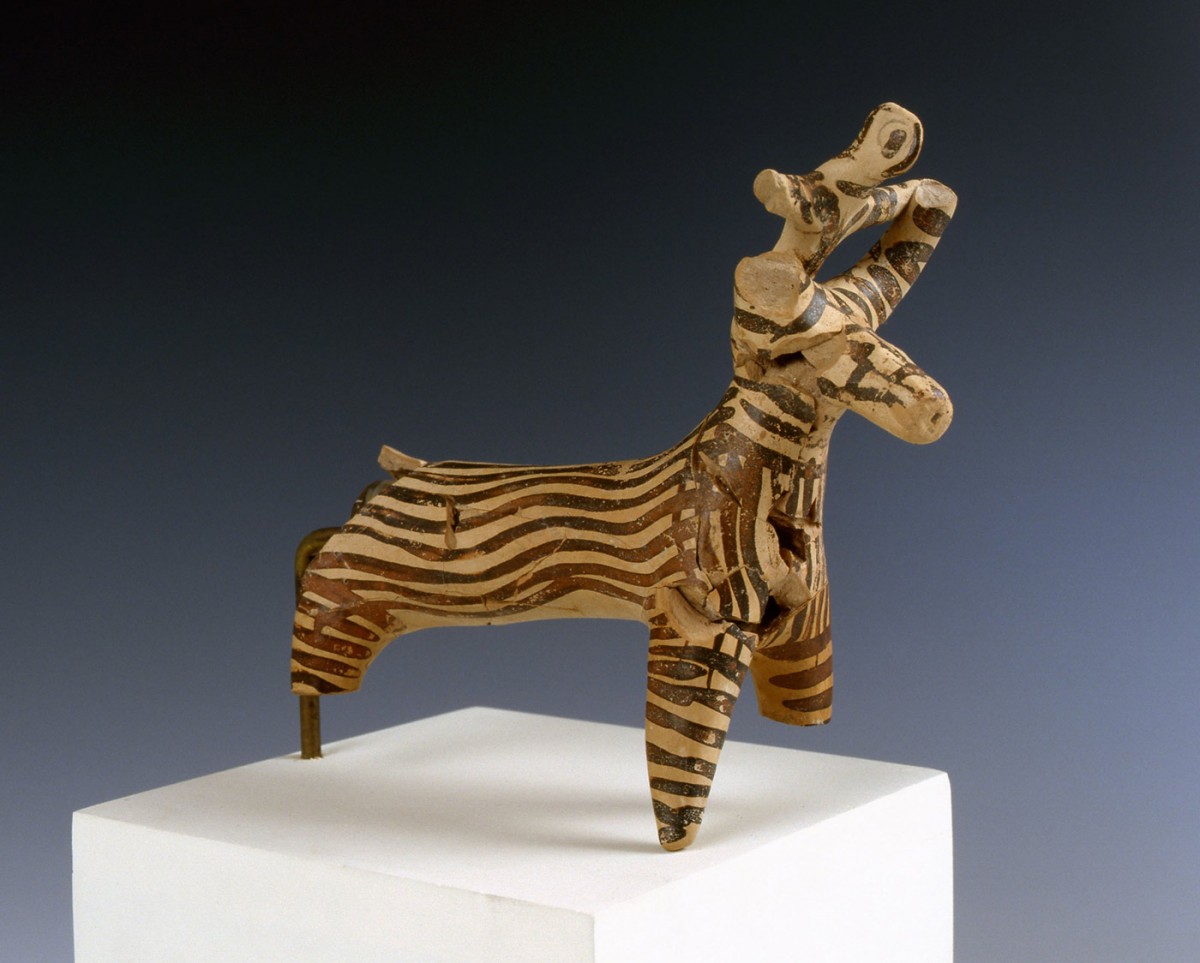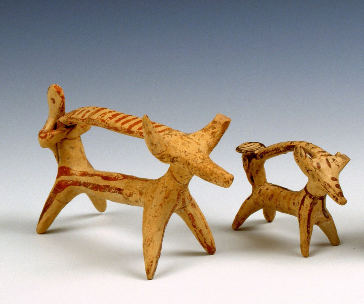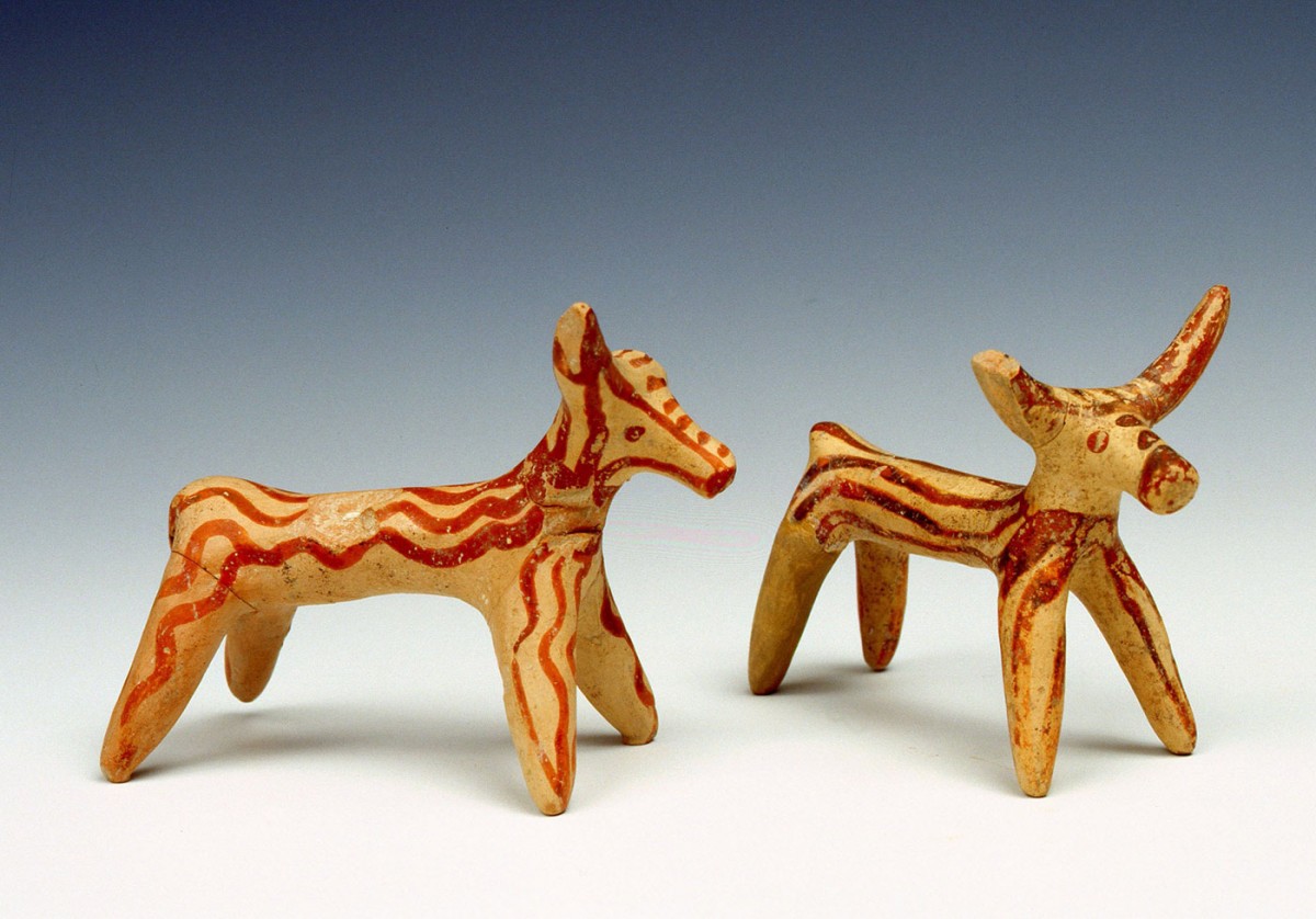 Ο αινιγματικός τύπος των μυκηναϊκών ειδωλίων που παριστάνουν βοοειδές με μια ανθρώπινη μορφή στα νώτα του (σημ. 10) αντιπροσωπευόταν εδώ από έναν ασυνήθιστα μεγάλο αριθμό. Μερικά από εκείνα δεν ήταν τόσο σχηματοποιημένα όσο τα άλλα γνωστά παραδείγματα του τύπου και μας έδωσαν έτσι την ευκαιρία να διαπιστώσουμε ότι δεν παριστάνουν άνθρωπο που οργώνει, όπως ήταν μέχρι τότε η επικρατέστερη άποψη, αλλά συμπτυγμένη βοϊδάμαξα που οδηγεί η μορφή στα νώτα του ζώου (εικ. 8). Την ίδια ερμηνεία είχε προτείνει παλαιότερα και ο Nicholls (σημ. 11), αλλά τώρα αυτή ενισχύεται με νέα στοιχεία. Σε ένα μικρογραφικό ειδώλιο αυτού του τύπου που βρέθηκε εδώ (εικ. 8, δεξιά) η μικροσκοπική μορφή στα νώτα του ζώου φαίνεται να κρατά ένα μανιταρόσχημο σκιάδιο. Τέτοια σκιάδια απαντούν συνήθως σε παραστάσεις αρμάτων και δεν θα ταίριαζαν σε έναν άνθρωπο που οργώνει.