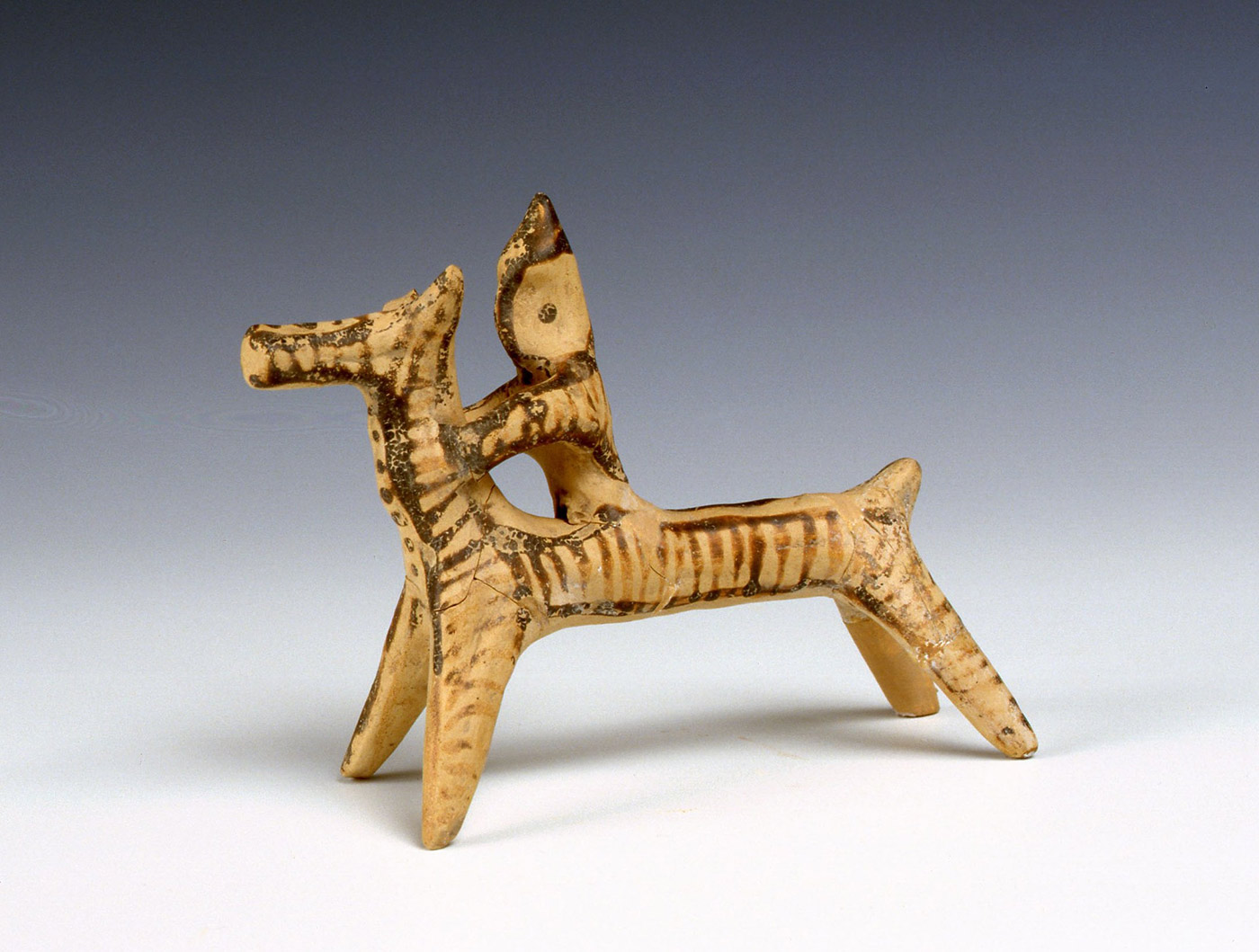 Την υπόθεση της λατρείας μιας ανδρικής θεότητας ενισχύουν τα πέντε ειδώλια ιππέων που βρέθηκαν εδώ (σημ. 8). Ο αριθμός τους είναι εκπληκτικός, εάν λάβουμε υπόψη τη σπανιότητα μυκηναϊκών ειδωλίων αυτού του τύπου, του οποίου δεν είχαμε προηγουμένως κανένα πλήρες παράδειγμα. Τα ειδώλια από τα Μέθανα δείχνουν έναν άνδρα με κράνος να κάθεται στη ράχη αλόγου και να πιάνει με τα τεντωμένα χέρια του το κεφάλι ή το λαιμό του ζώου (εικ. 6). Τα ειδώλια αυτά, καθώς και οι λιγοστές παραστάσεις ιππέων σε μυκηναϊκά αγγεία του Εικονιστικού Ρυθμού, δείχνουν ότι η ιππική τέχνη ήταν γνωστή στην Ελλάδα κατά την Ύστερη Εποχή του Χαλκού, αν και όχι πολύ διαδεδομένη. Το άλογο ήταν τότε κτήμα και σύμβολο κύρους των ανώτερων κοινωνικών τάξεων και κατά κανόνα χρησιμοποιείτο ζευγμένο σε άρμα. Η συμμετοχή έφιππων στρατιωτών σε μάχη δεν τεκμηριώνεται εικονογραφικά ή με άλλο τρόπο στην Ελλάδα πριν από τους ιστορικούς χρόνους. Κατά συνέπεια πρέπει να υποθέσουμε ότι οι κρανοφόροι ιππείς από τα Μέθανα παριστάνουν είτε ευγενείς που συμμετέχουν σε ειρηνικές εκδηλώσεις, π.χ. ιππικούς αγώνες, είτε μια ανδρική θεότητα που ίσως θεωρείτο ως ο δαμαστής και ο προστάτης των αλόγων.