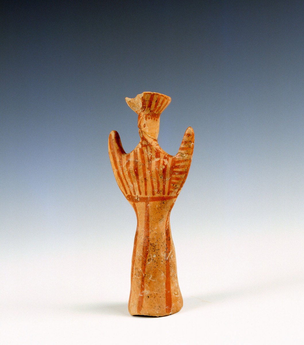 Στο μεγάλο σύνολο αναθηματικών ειδωλίων από το Δωμάτιο Α η γυναικεία μορφή δεν εμφανιζόταν με σαφή χαρακτηριστικά παρά μόνο μία φορά, σε ένα ειδώλιο του ειδικού τύπου Ψ με κοίλο στέλεχος (σημ. 12) (εικ. 9). Τέτοιου τύπου ειδώλια βρέθηκαν σε χώρους με θρησκευτική σημασία στις Μυκήνες, στη Μιδέα και στο Ιερό της Αφαίας, αλλά δεν λείπουν και τα παραδείγματα από οικιστικά ή ταφικά σύνολα, επομένως δεν φαίνεται να είχαν αποκλειστικά λατρευτική χρήση.