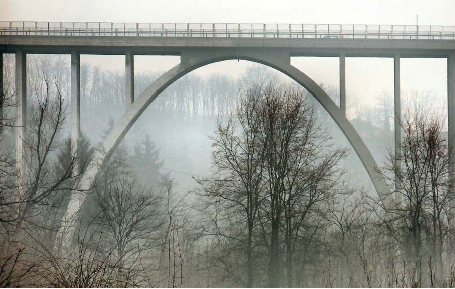 Και στη γεφυροποιία, η χρήση του λίθου εγκαταλείπεται σταδιακά, ωστόσο η στατική μορφή του τόξου, που συνδέθηκε κατ’ εξοχήν με τη λίθινη οικοδομική, συνεχίζει να επικρατεί μέσω του νέου υλικού. Το σκυρόδεμα εμφανίζει εξίσου μεγάλες αντοχές έναντι θλίψεως, γεγονός που το καθιστά κατάλληλο για την εν λόγω γεωμετρία.