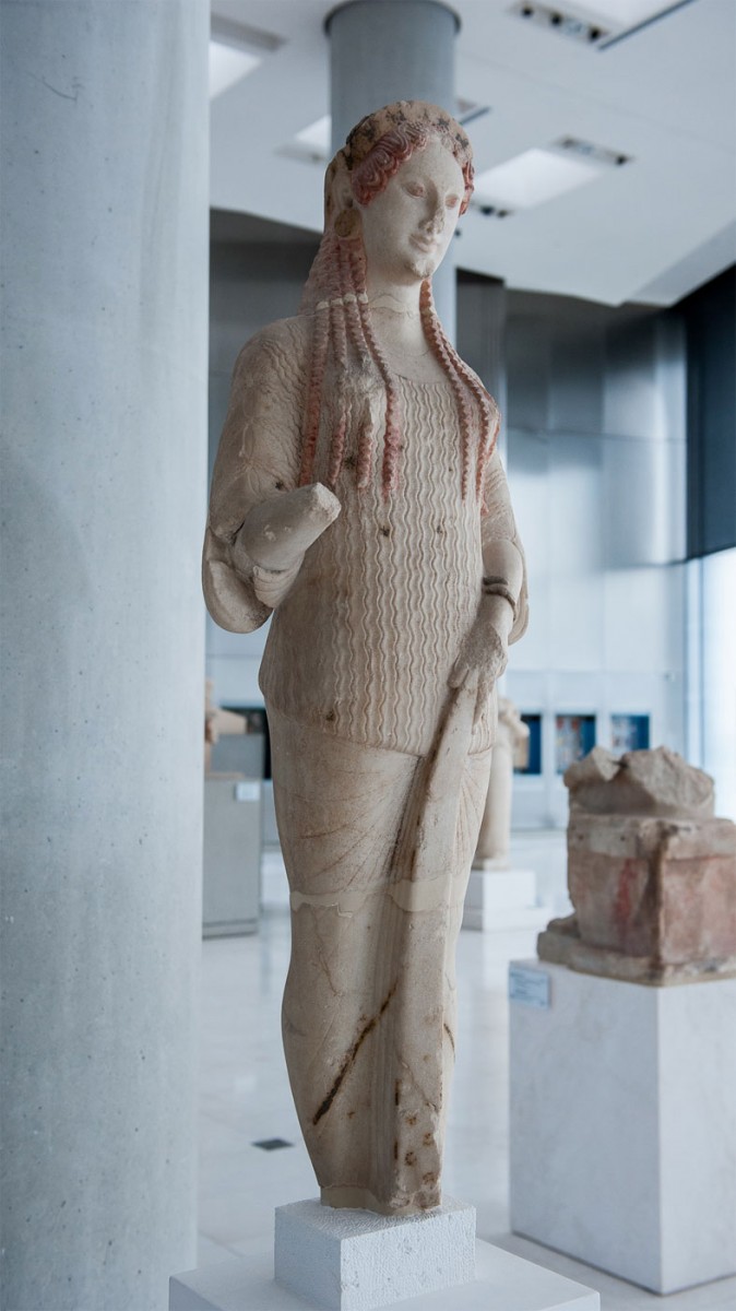 Οι Κόρες, τα μαρμάρινα αγάλματα νεαρών κοριτσιών, ήταν το πιο συνηθισμένο αφιέρωμα στο ιερό της Αθηνάς στην Ακρόπολη κατά την Αρχαϊκή Εποχή (6ος αι.-αρχές 5ου αι. π.Χ.). Τι αντιπροσωπεύουν δεν είναι γνωστό. Έχουν ερμηνευτεί ως θεές, ιέρειες, κορίτσια στην υπηρεσία της θεάς ή απλές θνητές. Όπως και τα άλλα γλυπτά της Ακρόπολης, έπεσαν θύμα της καταστροφικής μανίας των Περσών το 480 π.Χ. Η απόφαση των Αθηναίων να θάψουν τα συντρίμμια σε μεγάλους λάκκους στάθηκε η αιτία να διατηρηθούν τα ίχνη των χρωμάτων. Στις ανασκαφές της Ακρόπολης βρέθηκαν πάνω από 200 Κόρες διαφόρων μεγεθών, συμπεριλαμβανομένων και των θραυσμάτων τους, καθιστώντας αυτή τη συλλογή του Μουσείου Ακρόπολης τη μεγαλύτερη στον κόσμο.