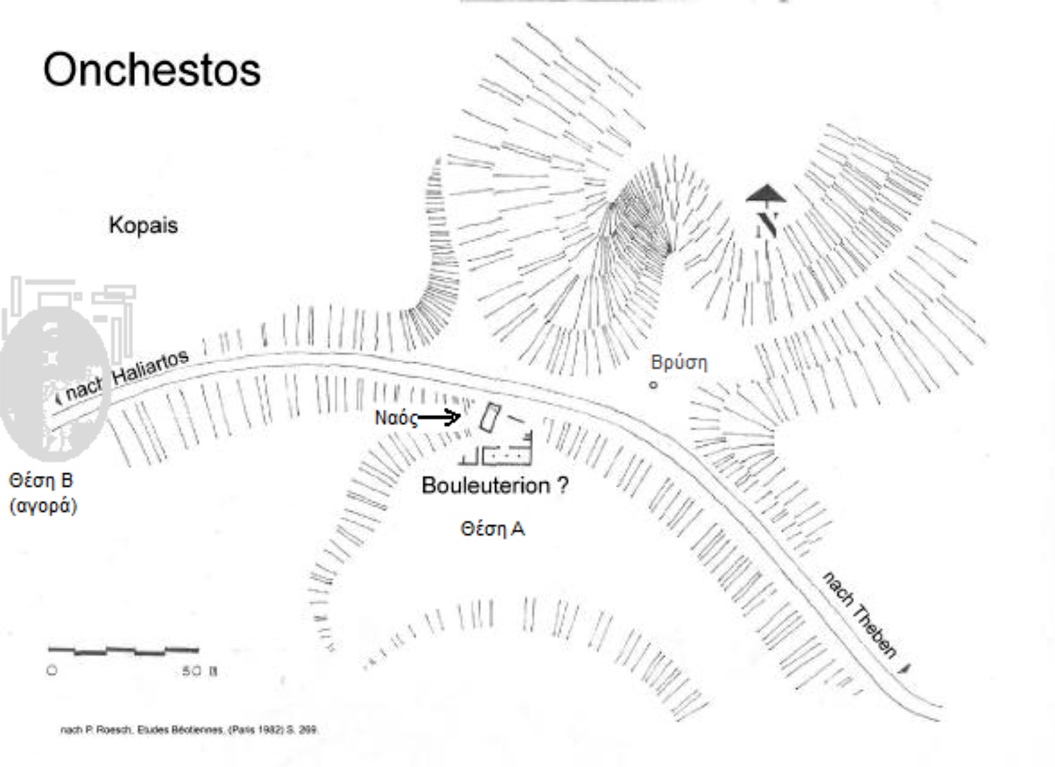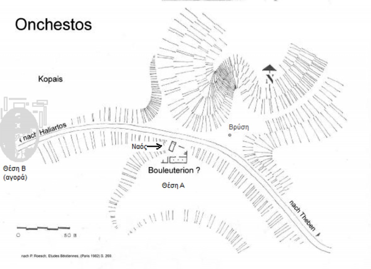 Η αναφορά του Πινδάρου σχετικά με τους ιππικούς αγώνες που λάμβαναν χώρα στις «Ογχήστιες ακρολιμνιές» (σημ. 35) προς τιμήν «του Κοσμοσείστη Ποσειδώνα που κατοικεί στην Ογχηστό…» (σημ. 36), μας προϊδεάζει για το χώρο, όπου τελούνταν οι αγώνες αυτοί, στο βαθμό που το στενό μεταξύ της Κωπαΐδας και του Ελικώνα, όπου ήταν κτισμένες οι πόλεις Ογχηστός και Αλίαρτος, αποτελούσε και το μοναδικό πέρασμα προς το ιερό.