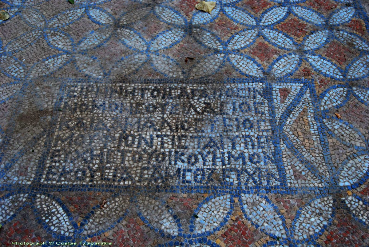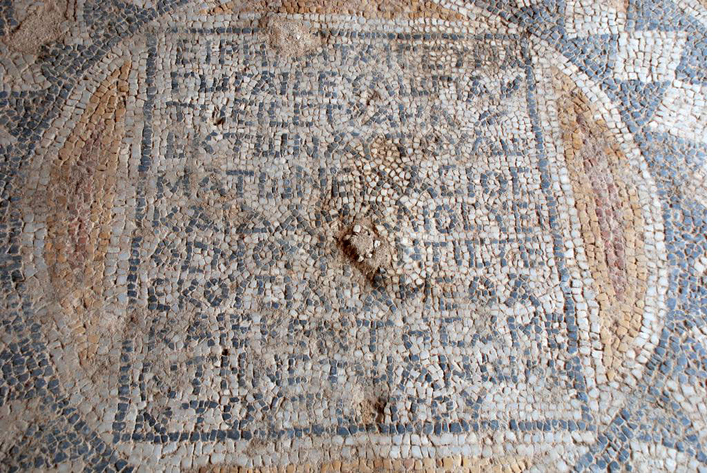Γνωρίζουμε πως η συναγωγή της εβραϊκής κοινότητας που βρισκόταν εντός του Κάστρου κατά τους πρώιμους χρόνους ονομαζόταν Baal ha Turim, δηλαδή ο Κύριος του Τουρίμ (σημ. 46). Ο εντοπισμός αυτής της συναγωγής και η ταύτισή της θα είχε οπωσδήποτε πολύ ενδιαφέρον. Πριν από λίγα χρόνια η Βυζαντινή Εφορεία Αρχαιοτήτων της Χίου αποκάλυψε εκτός του Κάστρου τμήμα ενός κτιρίου με ψηφιδωτά σε σωστική ανασκαφή κατά την εκσκαφή του οικοπέδου Καλλέργη στην περιοχή της Αγίας Άννας Καπέλλας (εικ. 8) (σημ. 47). Αρχικά, οι ανασκαφείς θεώρησαν πως επρόκειτο για μία παλαιοχριστιανική εκκλησία, καθώς τα μοτίβα των ψηφιδωτών που αποκαλύφθηκαν στο δάπεδο του κτιρίου αποτελούν κοινό τόπο στους οίκους λατρείας της χριστιανικής και της ιουδαϊκής θρησκείας εκείνη την περίοδο. Όμως, το κείμενο μίας εκ των ψηφιδωτών επιγραφών που βρέθηκαν στο χώρο, αποτελεί αδιάσειστο στοιχείο της ταυτότητας του κτιρίου. Πιο συγκεκριμένα, μαζί με τα ονόματα των δωρητών των ψηφιδωτών (Ιλάσιος και Δαμάσιος) (εικ. 9) αναφερόταν μεταξύ άλλων και η φράση «ειρήνη ταις Συναγωγαίς ευλογία τω Ισραήλ» (εικ. 10).