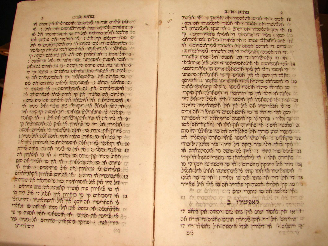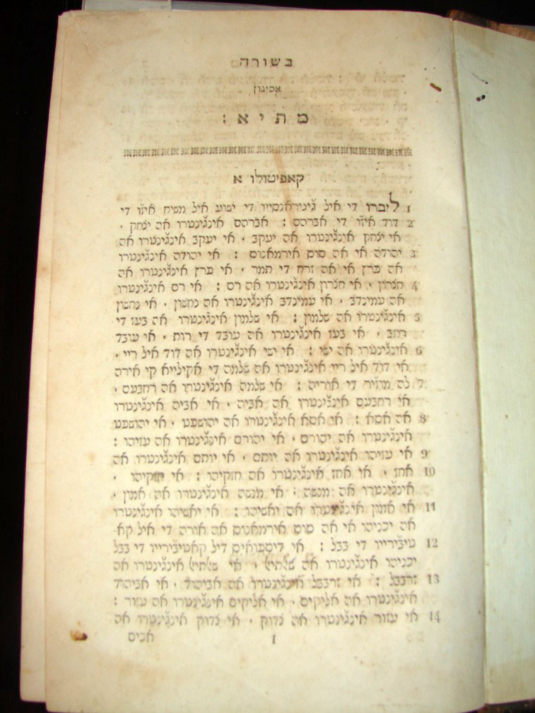 Μία ιδιαίτερη ανακάλυψη αντίκρισα στα υπόγεια της Δημόσιας Κεντρικής Ιστορικής Βιβλιοθήκης Χίου «Κοραής» της Χίου το 2013 και αφορούσε προφανώς κάποιο ή κάποια μέλη της εβραϊκής κοινότητας του νησιού. Ανάμεσα σε κάποια βιβλία που δεν είχαν ακόμα καταλογογραφηθεί υπήρχε και ένα βιβλίο σε σχετικά παλαιά κατάσταση γραμμένο σε εβραϊκό αλφάβητο. Μετά από λίγη ώρα ανάγνωσης αντιλήφθηκα πως πρόκειται για την Καινή Διαθήκη μεταφρασμένη στα λαντίνο (σημ. 54). Δυστυχώς, η σελίδα του τίτλου, του τόπου και της χρονολογίας έκδοσης του βιβλίου δεν υπάρχει, καθώς μάλλον έχει αφαιρεθεί (εικ. 14, 15, 16). Δεν γνωρίζουμε πώς έφτασε το βιβλίο στη Βιβλιοθήκη Κοραή. Αυτό όμως που μπορώ να εικάσω μετά από μία σύντομη έρευνα στο διαδίκτυο είναι πως κατά πάσα πιθανότητα πρόκειται για ένα βιβλίο που απευθυνόταν σε Εβραίους της κοινότητας της Χίου με σκοπό τον προσηλυτισμό τους στη χριστιανική θρησκεία.