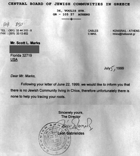 Είναι χαρακτηριστικό πως το 1999 το Κεντρικό Ισραηλιτικό Συμβούλιο σε αίτημα που του έγινε από κάποιον με ρίζες από την εβραϊκή κοινότητα της Χίου απάντησε πως εξαιτίας της μη ύπαρξης εβραϊκής κοινότητας πλέον στο νησί δεν μπορεί να του παράσχει καμία βοήθεια (εικ. 17) (σημ. 56). Σήμερα, η κοινότητα δεν υφίσταται πλέον, μόνο κάποια από τα κατάλοιπά της, κάποιος δρόμος μέσα στο Κάστρο με την ονομασία ενός Εβραίου να θυμίζει πως κάποτε περπάτησαν στα σοκάκια του οι άνθρωποι αυτοί, ενώ μερικές φορές κάποιοι απόγονοι επισκέπτονται το νησί αναζητώντας νοσταλγικά τις ρίζες τους.