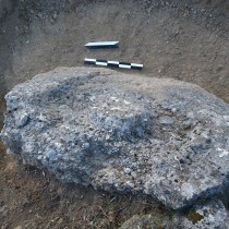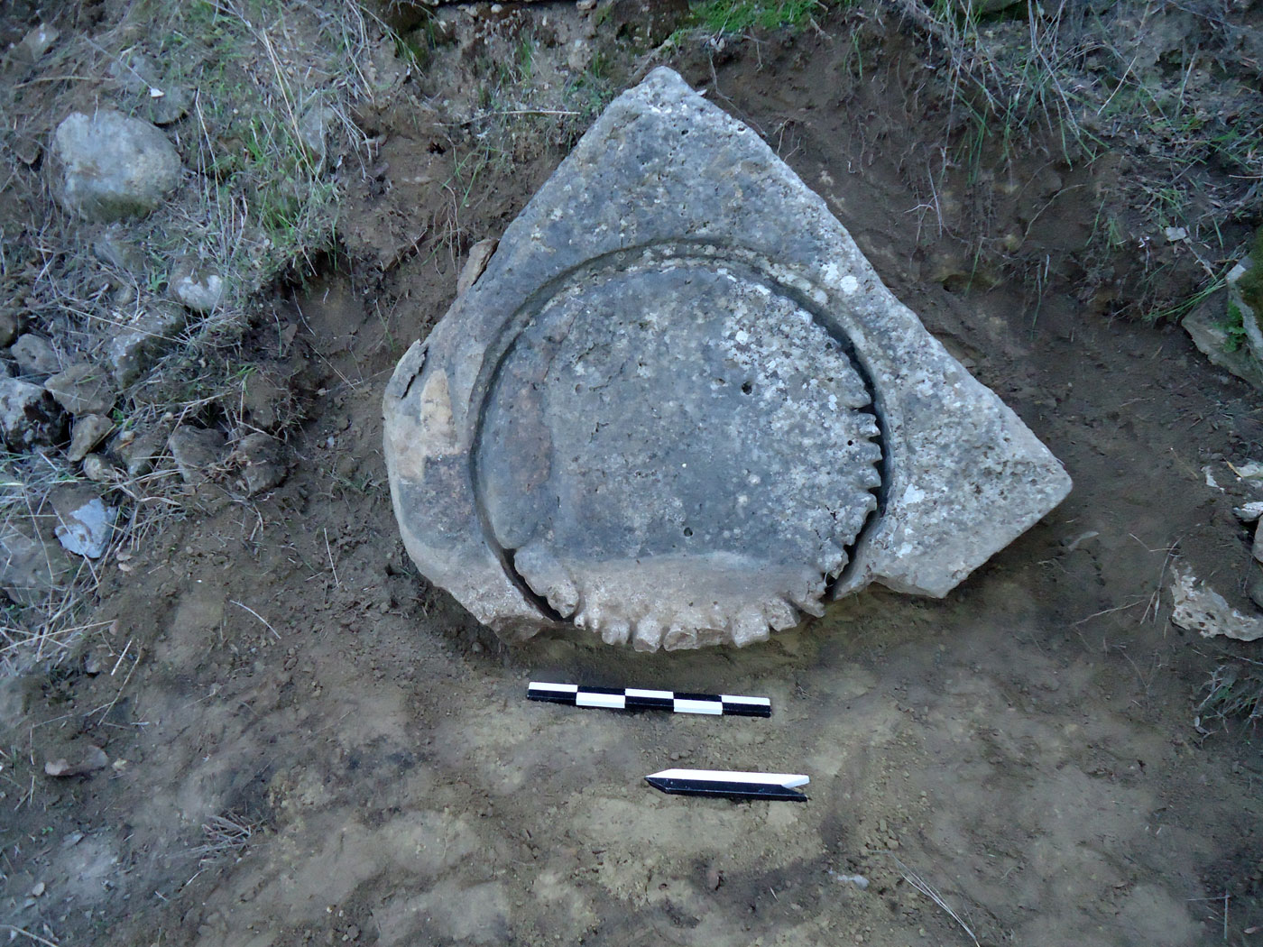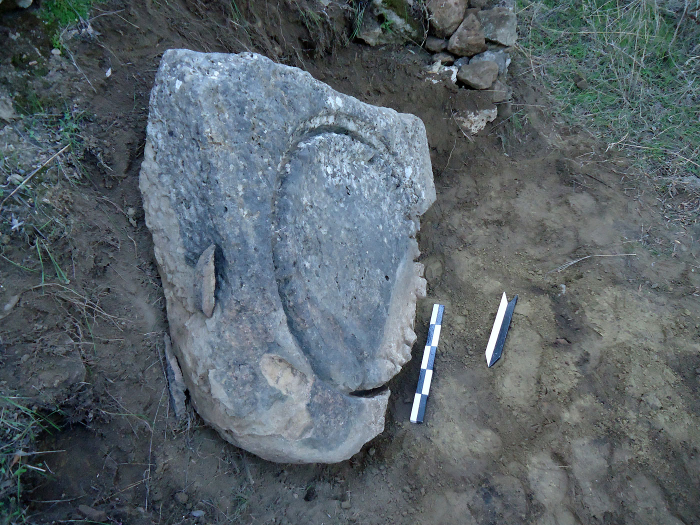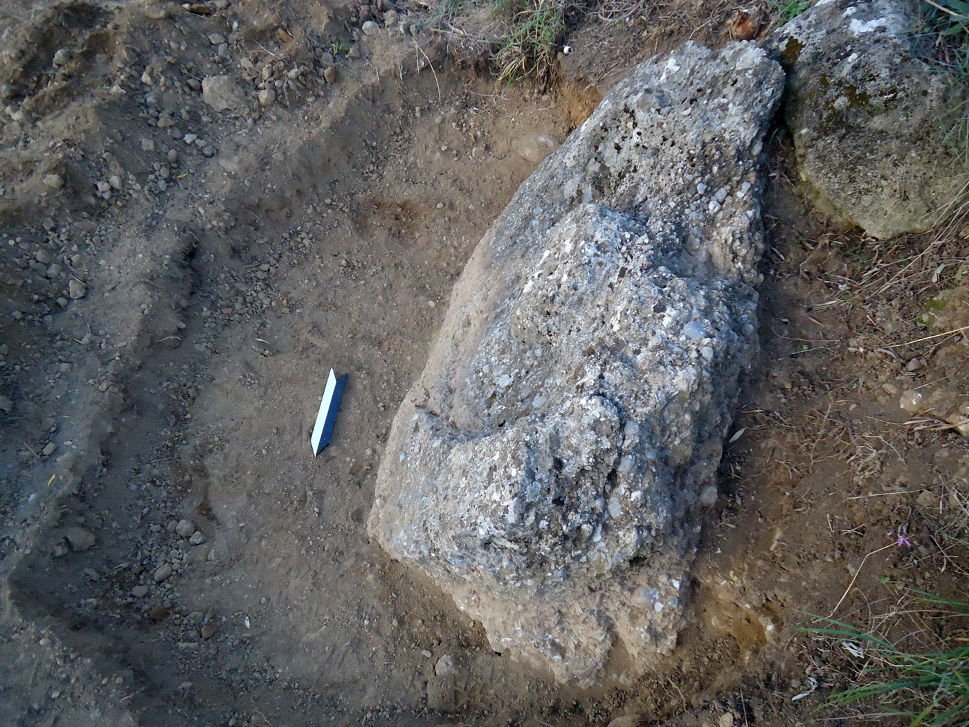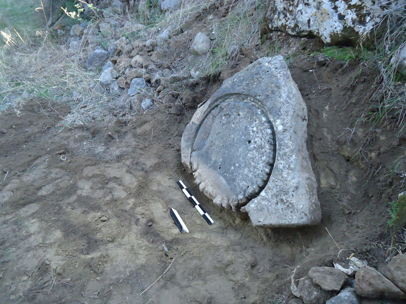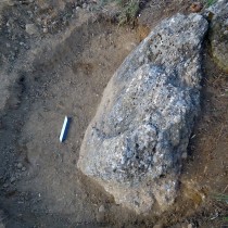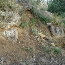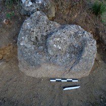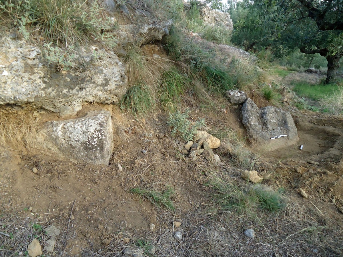 Από την αφαίρεση των χαλαρών ανοιχτοκάστανων χωμάτων που κάλυπταν το κατώτερο μη ορατό τμήμα του λαξευμένου βραχόλιθου, συλλέχθηκε αρκετός αριθμός μελαμβαφών οστράκων ελληνιστικών χρόνων καθώς και τμήματα κεράμων στέγης καλής όπτησης, που πιθανώς προέρχονται από αρχαίο οικοδόμημα που εντοπίστηκε στο πρανές της πλαγιάς, σε ελάχιστη απόσταση νότια από τον λαξευμένο βράχο. Από το οικοδόμημα αυτό είναι ορατό τμήμα τοίχου, κατεύθυνσης Β-Ν, επιμελημένης κατασκευής, αποτελούμενο από διπλή σειρά ορθογώνιων λιθοπλίνθων κτισμένων κατά το ισοδομικό σύστημα (εικ. 6).