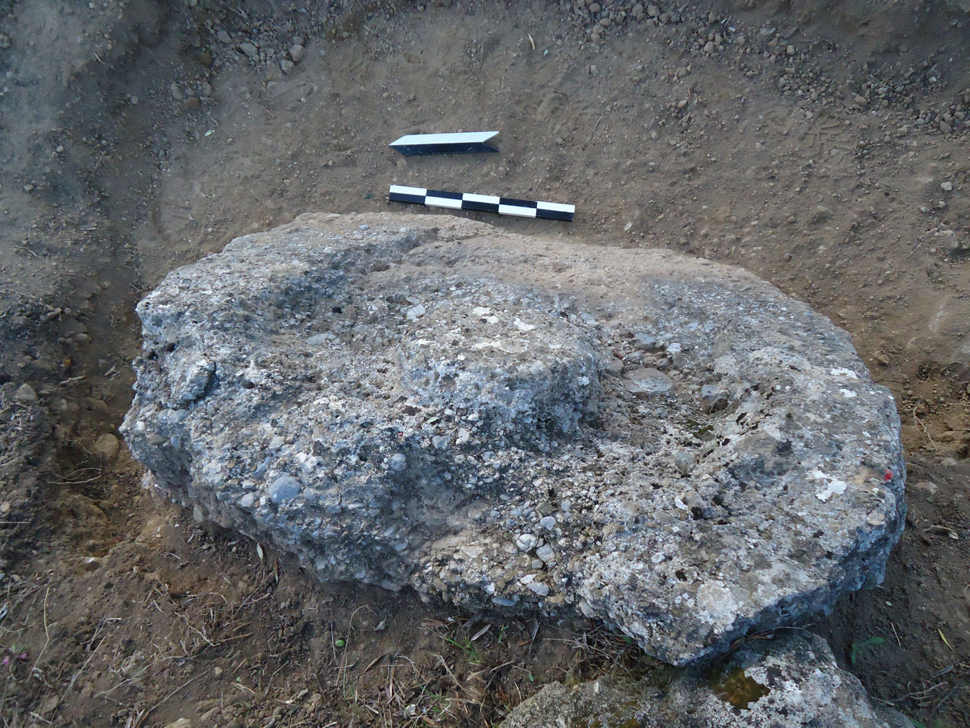 Η λαξευμένη κοιλότητα, αν και αβαθής, παραπέμπει σε λεκάνη ελαιόμυλου, του τύπου mola olearia, όπου γινόταν η σύνθλιψη του ελαιοκάρπου με τη χρήση κυλινδρικής μυλόπετρας που περιστρεφόταν μέσα στη λεκάνη με τη βοήθεια ξύλινου οριζόντιου άξονα. Λόγω της φθοράς του κεντρικού κυλινδρικού κιονίσκου δεν είναι δυνατό να γνωρίζουμε τον τρόπο με τον οποίο ήταν στερεωμένος o κάθετος άξονας ή η περόνη στην οποία προσαρμοζόταν η οριζόντια ξύλινη δοκός περιστροφής (σημ. 14) (εικ. 2-3-4).