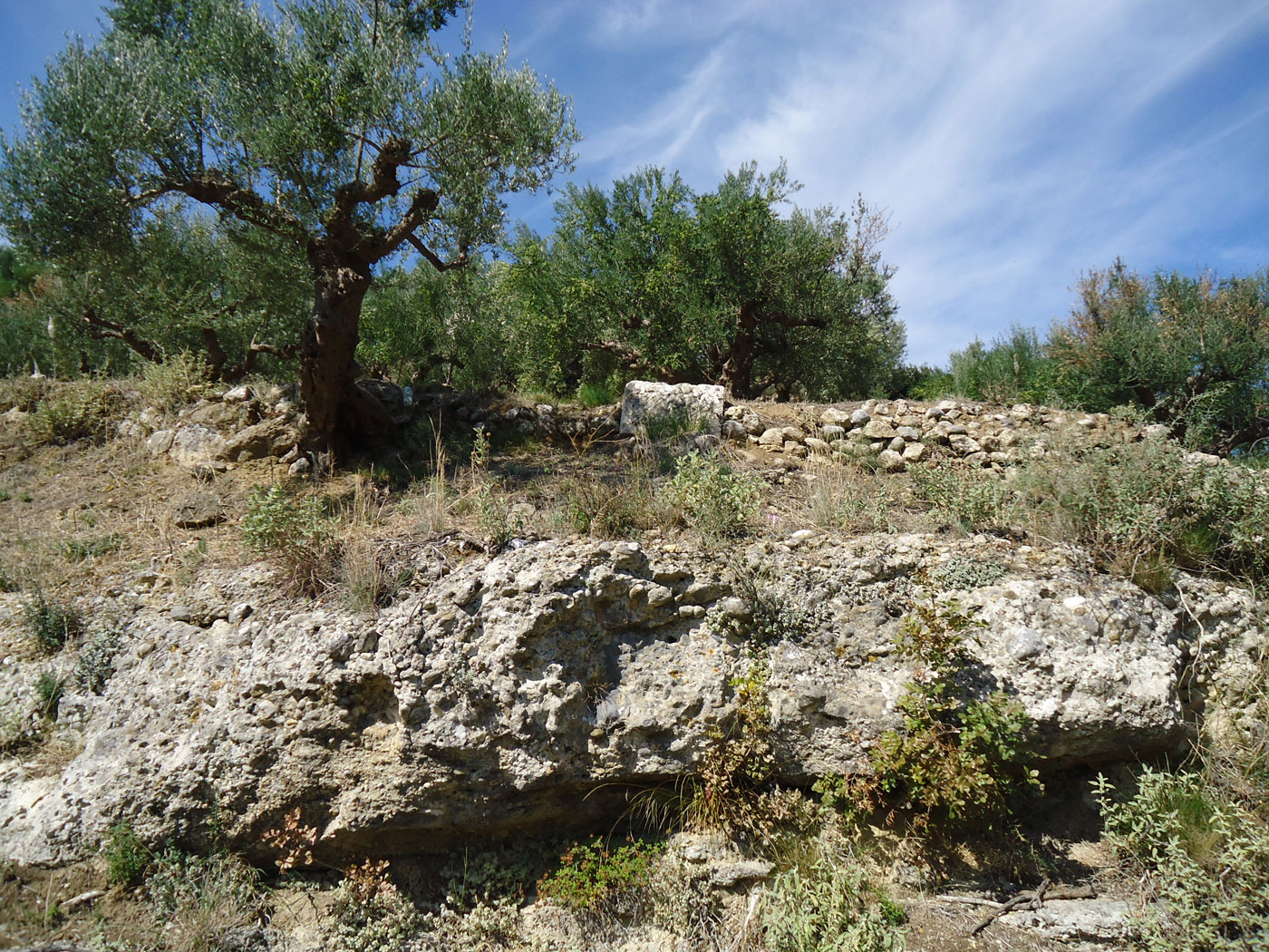 Ωστόσο είναι φανερό ότι η λειτουργία του ελαιόμυλου ήταν υπαίθρια, αφού είχε λαξευθεί κατάλληλα ο φυσικός κροκαλοπαγής βράχος, που προσφερόταν γι’ αυτή τη χρήση εφόσον ήταν πολύ σκληρός και ανθεκτικός (σημ. 15). Η κάθετη θέση στην οποία βρέθηκε ο ογκώδης λαξευμένος βράχος είναι προβληματική (σημ. 16). Κατά τη διερεύνηση που έγινε στο άμεσο περιβάλλον και κυρίως στο επίπεδο που σχηματίζεται πάνω από τον κάθετα σφηνωμένο βραχόλιθο, παρατηρήθηκε φυσικός σχηματισμός του εδάφους με στρώση («πάγκο») τεράστιων πλακοειδών κροκαλοπαγών βράχων, παρόμοιων με αυτόν (εικ. 5). Είναι επομένως πιθανόν το τμήμα του λαξευμένου βράχου-ελαιοτριβείου, το οποίο βρισκόταν στο «φρύδι» του πρανούς, να αποκολλήθηκε από το πλέγμα των υπόλοιπων βράχων που υπήρχαν στην υπερκείμενη επίπεδη επιφάνεια και να κατολίσθησε στην πλαγιά του υψώματος. Άλλωστε το φαινόμενο της κατολίσθησης των βράχων από την κορυφή του υψώματος της αρχαίας πόλης της Θουρίας στις παρειές (ανατολική και δυτική) κατά την αρχαιότητα έχει παρατηρηθεί σε μεγάλη κλίμακα και συνεχίζεται κατά καιρούς έως σήμερα (σημ. 17).
