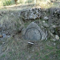 Η βάση ήταν ενσωματωμένη σε δεύτερη χρήση σε σύγχρονη ξερολιθιά κατεύθυνσης από Β-Ν, που οριοθετεί την ανατολική πλευρά του αγροκτήματος. Είναι κάθετα τοποθετημένη, έτσι ώστε η άνω επιφάνειά της να είναι ορατή στην πρόσοψη του τοιχαρίου (εικ. 7).