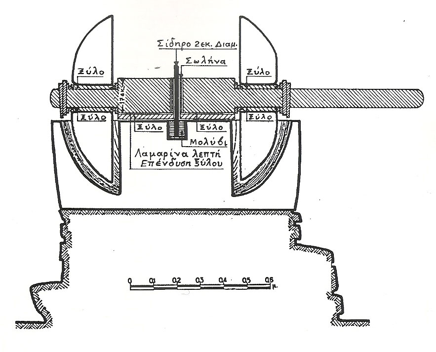 Οι απαρχές της καλλιέργειας της ελιάς στον ελλαδικό χώρο τοποθετούνται στην Πρώιμη εποχή του Χαλκού (3η χιλιετία π.Χ.), ενώ η εντατική και συστηματική καλλιέργειά της σημειώνεται στη Μυκηναϊκή εποχή (1680-1100 π.Χ.) (σημ. 25). Αρχικά, η σύνθλιψη του καρπού γίνεται χειρωνακτικά, μέσα σε μεγάλες λίθινες λεκάνες, ασκώντας πίεση με μια κυκλική πέτρα. Η έκθλιψη του ελαιοπολτού επιτυγχάνεται με τη χρήση πιεστηρίων. Πρόκειται για λίθινες βάσεις συμπίεσης κυκλικού ή ορθογώνιου σχήματος. Η πίεση του ελαιοπολτού γίνεται με τη μέθοδο του μοχλού, δηλαδή με μια ξύλινη δοκό προσαρμοσμένη σε εσοχή τοίχου / κοίλωμα βράχου ή κάποιας άλλης κατασκευής, στο ελεύθερο άκρο της οποίας ασκείται κάποια μορφή δύναμης είτε μυϊκής ή με τη χρήση λίθινων βαρών (σημ. 26).