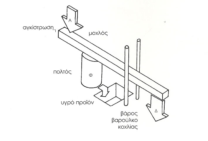 Η συμπίεση της ελαιοζύμης γίνεται στα ελαιοπιεστήρια ακολουθώντας βασικά την αρχή της χρήσης κάποιου βάρους, η οποία εξελίσσεται με την πάροδο των χρόνων (σημ. 10). Τα ελαιοπιεστήρια αποτελούνται από τη λίθινη βάση η οποία είναι τετράγωνη, κυκλική ή ελλειψοειδής και περιβάλλεται από κυκλικό αυλάκωμα (canalis rotunda), το οποίο καταλήγει σε αυλάκι εκροής με συνήθως προεξέχουσα προχοή. Επάνω στη βάση αυτή, η οποία είναι τοποθετημένη σε υπερυψωμένο επίπεδο, στοιβάζονται οι πάνινοι σάκοι με τον ελαιοπολτό. Το υγρό που προέρχεται από τη συμπίεση των σάκων συγκεντρώνεται σε αγγεία ή δεξαμενές που τοποθετούνται κάτω από την προχοή. Ο απλούστερος και παλαιότερος τρόπος συμπίεσης γινόταν με τη χρήση λίθινων βαρών, που ήταν κρεμασμένα στην άκρη ξύλινου μοχλού, το ένα άκρο του οποίου ήταν σταθερά στερεωμένο σε εσοχή του τοίχου (σημ. 11) (σχέδιο 3). Αργότερα, στην Ελληνιστική εποχή, χρησιμοποιήθηκε το βαρούλκο ως μηχανισμός ανύψωσης του βάρους, ενώ στους Ρωμαϊκούς χρόνους εισάγεται ο κοχλίας που εδράζεται σε λίθινη βάση με χαρακτηριστικούς τόρμους (γαλεάγρα) (σημ. 12). Για τη διευκόλυνση της εξαγωγής του λαδιού ο ελαιοπολτός βρέχεται με άφθονο ζεστό νερό κατά τη διάρκεια της συμπίεσης.