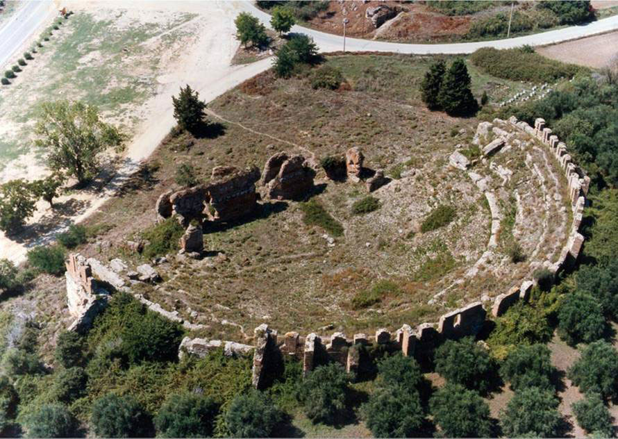 Το μνημείο κατασκευάστηκε στα χρόνια του Αυγούστου, ως μέρος των υποδομών για τα Άκτια, τους αγώνες που ήταν αφιερωμένοι στον Απόλλωνα, και οι οποίοι, μετά τη νίκη του ιδρυτή της ρωμαϊκής αυτοκρατορίας στη ναυμαχία του Ακτίου το 31 μ. Χ., απέκτησαν παγκόσμιο χαρακτήρα (όπως τα Ολύμπια, τα Νέμεα, τα Ίσθμια και τα Πύθια). Οι αγώνες, εκτός από αθλητικοί, ήταν και μουσικοί, οι οποίοι λάμβαναν χώρα στο θέατρο. Το μνημείο βρίσκεται έξω από την τειχισμένη πόλη, στο «Προάστειο», περιοχή που αναφέρει ο Στράβωνας και στην οποία ο Αύγουστος μετέφερε τον χώρο τέλεσης των Ακτίων (πριν γίνονταν στο Άκτιο).