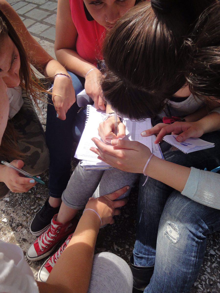Κάθε ομάδα προσπαθούσε να εντοπίσει το κρυμμένο στο χώρο χαρτάκι που ανέγραφε το γρίφο και στη συνέχεια επιχειρούσε να τον λύσει (εικ. 3). Οι κρυψώνες δεν ήταν ιδιαίτερα δύσκολες, έτσι ώστε να μην καθυστερήσουμε τη διαδικασία, καθώς ιδιαίτερη έμφαση δώσαμε στην επίλυση των γρίφων και στον εντοπισμό των αρχαιοτήτων. Η απάντηση της κάθε ομάδας γραφόταν στο μπλοκάκι που είχε παραλάβει στην αρχή του παιχνιδιού (εικ. 4) και δινόταν στους κριτές, οι οποίοι επιβεβαίωναν ή όχι την ορθότητά της. Σε περίπτωση λανθασμένης απάντησης η ομάδα είχε δικαίωμα να ξαναπροσπαθήσει όσες φορές επιθυμούσε. Για να ολοκληρωθεί η διαδικασία έπρεπε όλες οι ομάδες να δώσουν μια απάντηση ή να δηλώσουν ότι εγκαταλείπουν την προσπάθεια. Η ομάδα που απαντούσε πρώτη έπαιρνε 30 βαθμούς. Η δεύτερη 25, η τρίτη 20, η τέταρτη 15, η πέμπτη 10 και η έκτη 5 βαθμούς. Αν κάποια ομάδα εγκατέλειπε την προσπάθεια χωρίς απάντηση, μηδενιζόταν.
