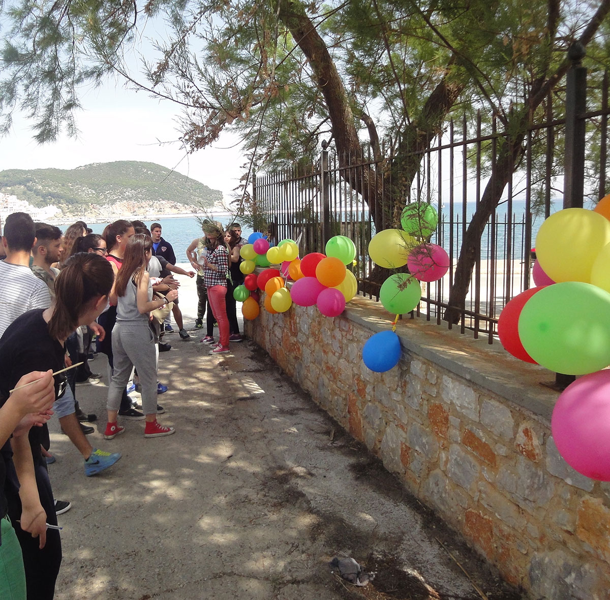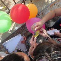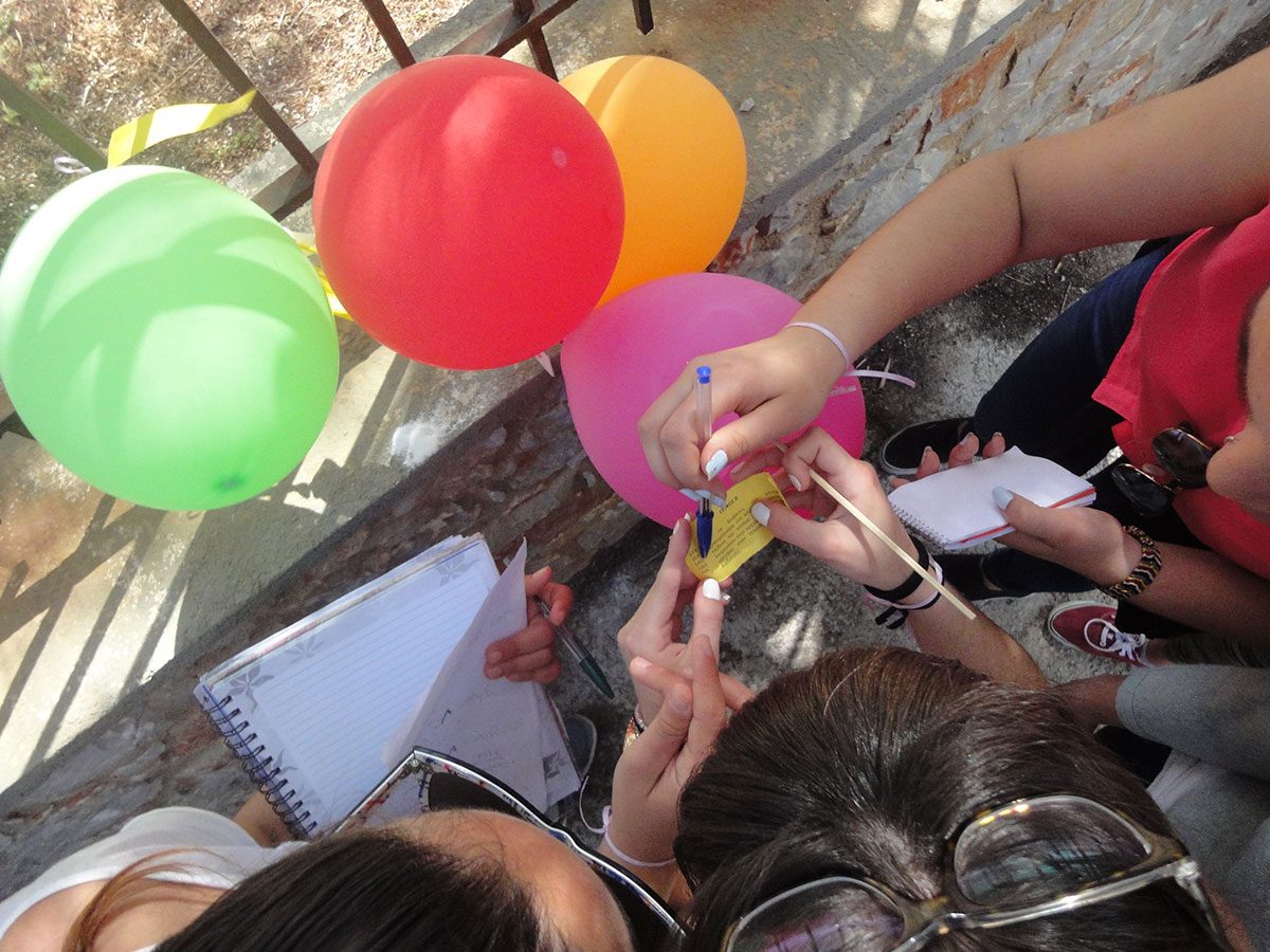 Μέσα στο μπλοκάκι υπήρχαν δύο εργαλεία, ένας πίνακας και ένα κείμενο, που θα χρησιμοποιούσαν οι μαθητές ως βοηθητικά για την επίλυση αντίστοιχων γρίφων. Επίσης, για τον εντοπισμό του χαρτιού που έφερε τον όγδοο γρίφο χρησιμοποιήθηκε ένα ξύλινο καλαμάκι, που είχαν προμηθευτεί οι ομάδες στην αρχή του παιχνιδιού χωρίς να γνωρίζουν τη χρησιμότητά του. Με αυτό οι μαθητές έσκασαν τα φουσκωμένα μπαλόνια που ήταν δεμένα με το χρώμα της ομάδας τους (εικ. 5) και εντόπισαν το χαρτάκι με το γρίφο (εικ. 5-6). Για να μη διακρίνεται το περιεχόμενο των μπαλονιών ήταν γεμισμένα με αλάτι. Η παραπάνω δοκιμασία πρόσθεσε μια παιχνιδιάρικη νότα στην όλη διαδικασία και διασκέδασε πολύ τους μαθητές τόσο κατά την εκτέλεση, όσο και κατά την οργάνωσή της.