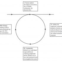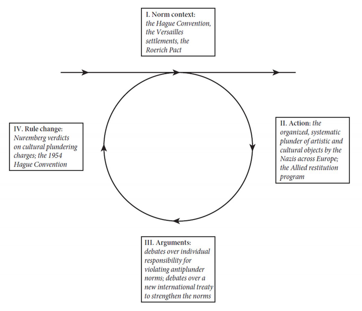 Ως εκ τούτου, οι νικητές του Β’ Παγκοσμίου Πολέμου άλλαξαν τη νόρμα, καταρχάς με τις Δίκες της Νυρεμβέργης, όπου ορίσθηκε ότι οι σκόπιμες καταστροφές των μνημείων αποτελούν έγκλημα πολέμου και καθιερώθηκε η αρχή της ποινικής ευθύνης, αποδιδόμενη όχι μόνο από τις κυβερνήσεις των εγκληματιών, αλλά και από την ίδια τη διεθνή κοινότητα (σημ. 9). Οι Δίκες της Νυρεμβέργης δημιούργησαν ένα μοντέλο για διεθνή δικαστήρια, όπως αυτό για την πρώην Γιουγκοσλαβία και το Διεθνές Ποινικό Δικαστήριο, μέσω του οποίου εδραιώθηκε η στροφή στην αντίληψη της αποδεκτής συμπεριφοράς απέναντι στα πολιτιστικά αγαθά σε καιρό πολέμου (σημ. 10).