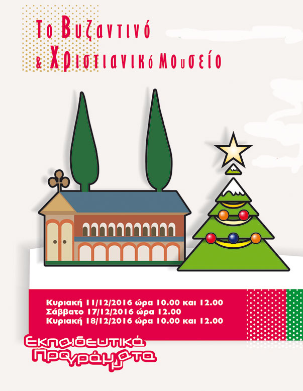 Χριστουγεννιάτικα εργαστήρια για παιδιά ηλικίας 5 έως 8 ετών διοργανώνει το Βυζαντινό και Χριστιανικό Μουσείο την Κυριακή 11 Δεκεμβρίου (ώρα 10.00 και 12.00), το Σάββατο 17 Δεκεμβρίου (ώρα 12.00) και την Κυριακή 18 Δεκεμβρίου 2016 (ώρα 10.00 και 12.00).