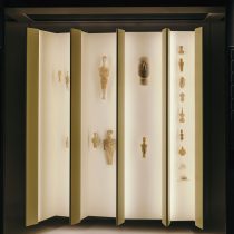 —«Πίστεις και δοξασίες»: Στην πέμπτη ενότητα παρουσιάζονται αντικείμενα, όπως π.χ. το «αγγείο των περιστεριών», τηγανόσχημο σκεύος με παραστάσεις κυμάτων και αστρικών συμβόλων αλλά και του γυναικείου ηβικού τριγώνου, κέρνοι, μια πλάκα με παράσταση σπείρας, το γυναικείο άγαλμα και το τμήμα ανδρικού αγάλματος, το λεγόμενο «αρσενικούδι», από το Μουσείο Κυκλαδικής Τέχνης, τα οποία έχουν σχετιστεί με την ύπαρξη θρησκευτικών και μεταφυσικών αντιλήψεων και την άσκηση τελετουργιών κατά την Πρωτοκυκλαδική περίοδο.