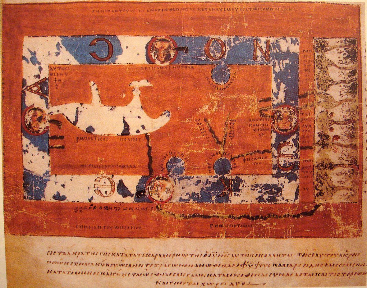 Το 550 μ.Χ., την εποχή του Ιουστινιανού Α’, ένας έμπορος από την Αλεξάνδρεια, γνωστός ως Κοσμάς ο Ινδικοπλεύστης (ταξιδιώτης της Ινδίας) αποτυπώνει σε χάρτη μία θεωρία του κόσμου. Σύμφωνα με αυτήν, η Γη επιπλέει στον Ωκεανό και είναι ορθογώνια παραλληλόγραμμη, όπως, άλλωστε και η Αγία Τράπεζα. Όλα ξεκινάνε από τον Παράδεισο, ο οποίος βρίσκεται στην Ανατολή.