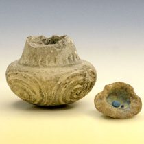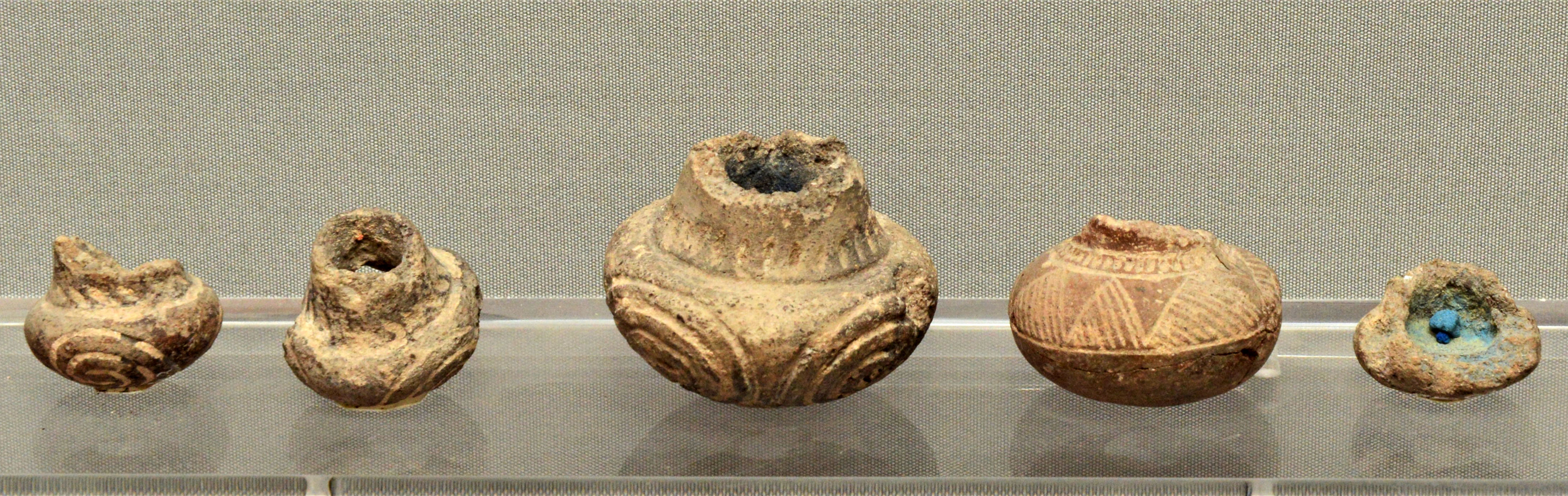 Τα πέντε μικροσκοπικά πήλινα αγγεία έχουν ύψος που κυμαίνεται μεταξύ 2 και 3 εκατοστών. Είναι διακοσμημένα με εγχάρακτες σπείρες και τρίγωνα και τέσσερα από αυτά σώζουν στο εσωτερικό τους ίχνη ή σβώλους αζουρίτη, πολύτιμης χρωστικής ύλης με ζωηρό μπλε χρώμα, προϊόν των μεταλλευμάτων χαλκού. Βρέθηκαν (μαζί με ένα έκτο που δεν εκτίθεται) σε έναν εξαιρετικά πλούσιο τάφο της Νάξου που χρονολογείται στην Πρωτοκυκλαδική Ι/ΙΙ περίοδο, γύρω στο 2700 π.Χ.