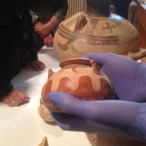 Με ιδιαίτερη συγκίνηση και θαυμασμό παρουσιάστηκαν την περασμένη Παρασκευή για πρώτη φορά στο Εθνικό Αρχαιολογικό Μουσείο τα 33 αρχαία αντικείμενα και τα 600 νομίσματα που κατασχέθηκαν πρόσφατα σε χέρια αρχαιοκαπήλων στο Μόναχο. Τα οκτώ κιβώτια με τους αρχαιολογικούς θησαυρούς που μεταφέρθηκαν με μεγάλη μυστικότητα από τη γερμανική πόλη, ανοίχτηκαν στο αμφιθέατρο του μουσείου, παρουσία της υπουργού Πολιτισμού και Αθλητισμού, Λυδίας Κονιόρδου. Το ΑΠΕ-ΜΠΕ κατέγραψε τη διαδικασία από το άνοιγμα των κιβωτίων, όπου με ασφάλεια είχαν τοποθετηθεί τα αντικείμενα, ως την παραλαβή τους από τους συντηρητές του Εθνικού Αρχαιολογικού Μουσείου. Επίσης, θαύμασε τα αριστουργήματα, που βρίσκονταν τα περισσότερα σε πολύ καλή κατάσταση. Πρόκειται κυρίως για ψευδόστομους αμφορείς, πτηνόσχημα αγγεία, ένα πήλινο άγαλμα με ηνίοχο και δύο αναβάτες, καθώς και άλλα μικροαντικείμενα, τα περισσότερα από τα οποία, σύμφωνα με τις πρώτες εκτιμήσεις των αρχαιολόγων, ανήκουν στον 12ο και 13ο αιώνα π.Χ., προερχόμενα πιθανόν από τάφους της βορειοδυτικής Πελοποννήσου.