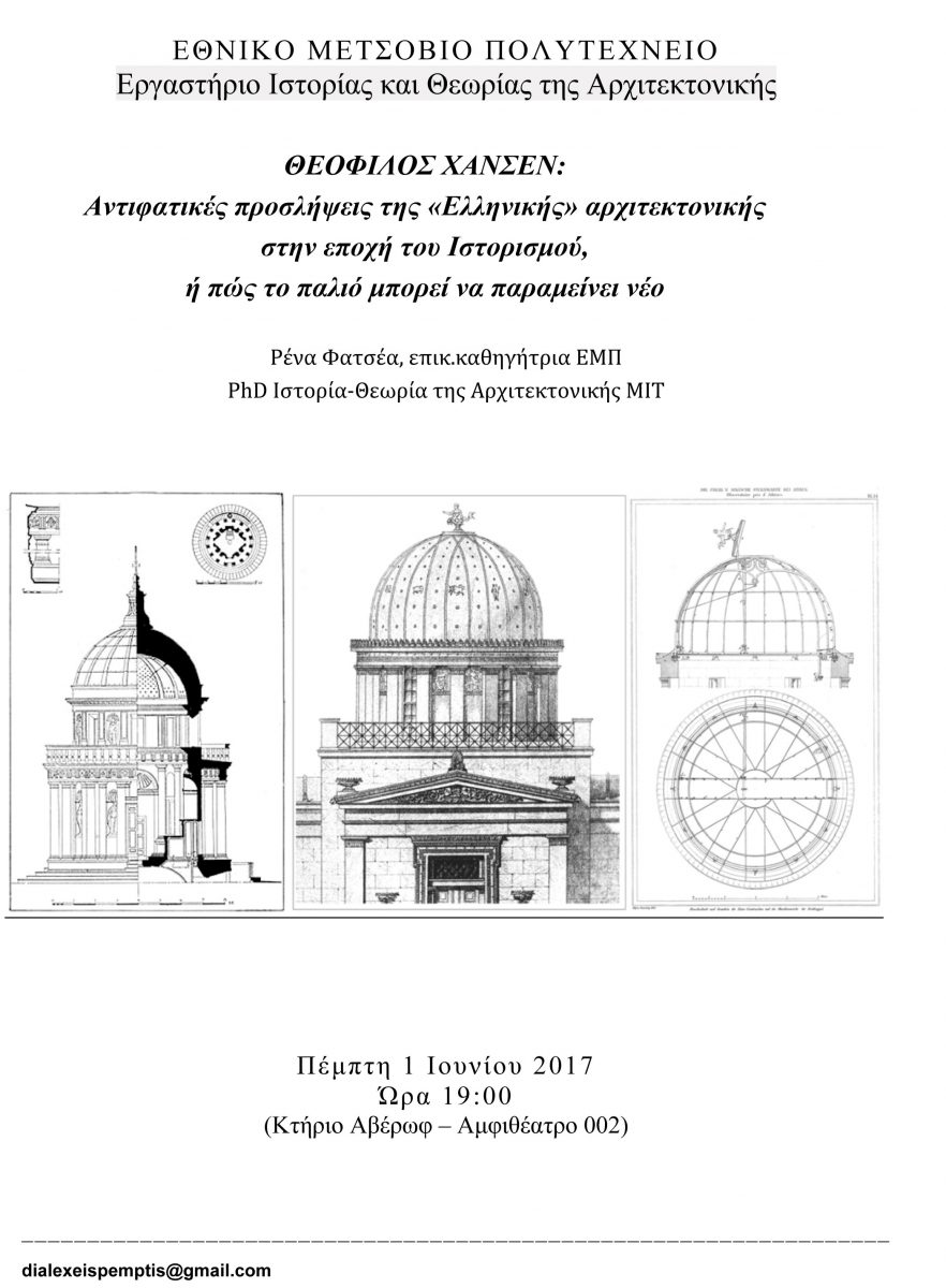 Η διάλεξη έχει τίτλο «Θεόφιλος Χάνσεν: Αντιφατικές προσλήψεις της “Ελληνικής” αρχιτεκτονικής στην εποχή του Ιστορισμού, ή πώς το παλιό μπορεί να παραμείνει νέο» και θα πραγματοποιηθεί την Πέμπτη 1 Ιουνίου 2017, και ώρα 19.00, στη Σχολή Αρχιτεκτόνων Μηχανικών ΕΜΠ (Κτήριο Αβέρωφ, Αμφιθέατρο 2, Πατησίων 42).