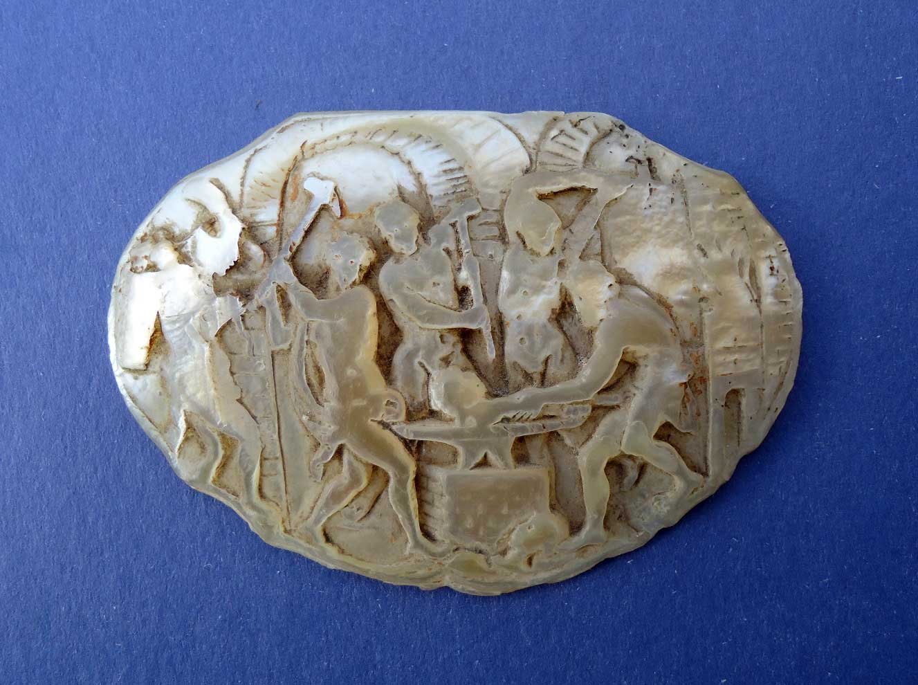 Αναζητώντας, πιο συγκεκριμένα, το έργο που αντιγράφεται στο σεντεφένιο πλακίδιο, θα σταθούμε σε ένα προσχέδιο με κόκκινη κιμωλία, φιλοτεχνημένο το 1620 από τον Ιταλό γλύπτη Allesandro Algardi (1598-1654) (σημ. 15). Oι ομοιότητες τόσο στη διάταξη και στη στάση των μορφών, όσο και στα αρχιτεκτονικά στοιχεία (καμάρες, αναμμένος κλίβανος) είναι εμφανείς.