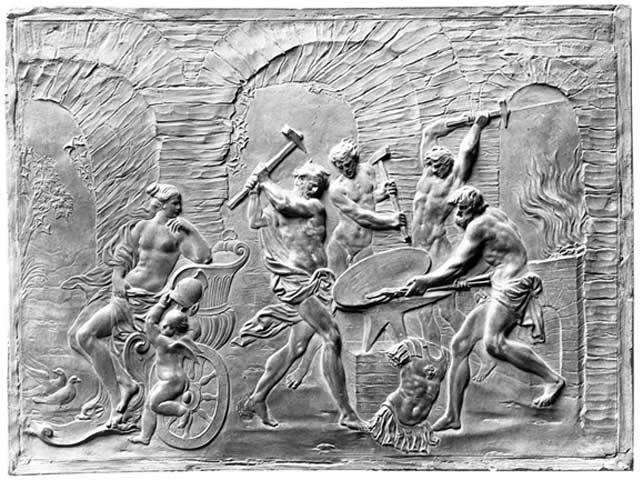 Η σκηνή του αρχαίου χαλκουργείου παραπέμπει άμεσα στον μυθολογικό κύκλο του εργαστηρίου του Ηφαίστου, θέμα διαχρονικά αγαπητό στην τέχνη (σημ. 7). Παραστάσεις με το εργαστήρι του Hφαίστου μάς είναι γνωστές ήδη από την αττική αγγειογραφία των κλασικών χρόνων (σημ. 8). Η σύνθεση με τους τρεις Κύκλωπες να σφυρηλατούν όρθιοι τον κεραυνό του Δία (σημ. 9) αποκρυσταλλώνεται στη ρωμαϊκή τέχνη, όπως βλέπουμε σε τοιχογραφίες και ψηφιδωτά πολυτελών ρωμαϊκών επαύλεων (σημ. 10), αλλά και σε εικονογραφημένο χειρόγραφο του Βιργίλιου (σημ. 11) (εικ. 2). Την ίδια περίοδο, ο μύθος του Προμηθέα που κλέβει τη φωτιά από το εργαστήριο του Ηφαίστου παριστάνεται σε δύο ρωμαϊκές μαρμάρινες σαρκοφάγους (σημ. 12). Στη συνέχεια οι καλλιτέχνες της Αναγέννησης, που αντλούσαν τύπους, μορφές και λύσεις από τα έργα της κλασικής αρχαιότητας ή από τα αριστουργηματικά ανάγλυφα των σαρκοφάγων (σημ. 13), μετέγραψαν με τη σειρά τους το συγκεκριμένο θέμα με διάφορες παραλλαγές, όπως φαίνεται στα έργα των Giorgio Vasari (1511-1574), Jacopo Tintoretto (1518-1594), Francesco Primaticcio (1504-1570), Frans Floris de Vriendt (1517-1570), Antonio Lombardo (1458-1516) κ.ά. Την παράσταση συνέχισαν να πραγματεύονται εκπρόσωποι της τέχνης του Μπαρόκ, όπως ο Diego Velázquez (1599-1660), ενώ από τον 16ο αιώνα και εξής τη βρίσκουμε συχνά σε έργα χαρακτικής και χαλκογραφίας (σημ. 14).