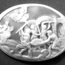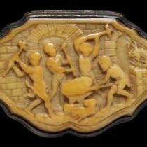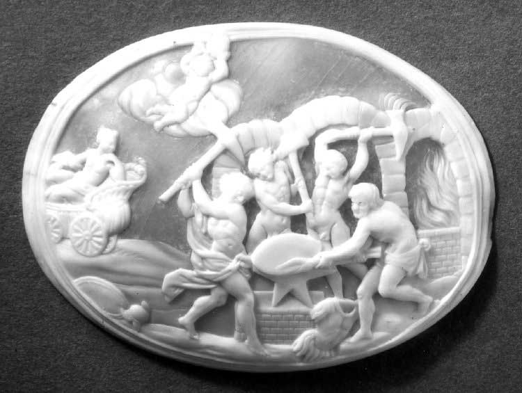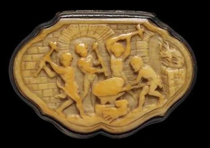 Παραλλαγή της παράστασης, που συνιστά κοντινό παράλληλο με το εύρημα του Μουσείου Θυρρείου, βρίσκουμε σε μια καμέα πλάτους 7,6 εκ., η οποία πιθανόν κατασκευάστηκε στη Γερμανία τον 17ο αιώνα και σήμερα φυλάσσεται στο Βρετανικό Μουσείο (σημ. 18). Στο λευκό όστρακο, που πιθανόν διακοσμούσε το σκέπασμα κουτιού, έχει σκαλιστεί η επίμαχη σκηνή, αλλά επιπλέον εδώ δηλώνεται ο ουρανός και ένας ιπτάμενος ερωτιδέας (εικ. 4). Παρεμφερής είναι και η ανάγλυφη παράσταση που φέρει η ελεφαντοστέινη επένδυση ασημένιας ταμπακοθήκης, η οποία πιθανόν κατασκευάστηκε στη Διέπη της Γαλλίας, στο α΄ μισό του 18ου αι (εικ. 5). Τεχνοτροπικά είναι αμελέστερη σε ό,τι αφορά την απόδοση των μορφών, ενώ η εικονογράφηση περιορίζεται στις τέσσερις μορφές που περιβάλλουν το αμόνι και σφυρηλατούν τον οπλισμό πολεμιστή (σημ. 19). Όπως βλέπουμε, η παράσταση κάθε φορά επιδέχεται αλλαγές, ωστόσο στην περίπτωση του πλακιδίου από το Θύρρειο, ο καλλιτέχνης έχει απομακρυνθεί –άγνωστο γιατί– από το μυθολογικό αφήγημα, καθώς παριστάνει τους Κύκλωπες να κατασκευάζουν αγάλματα, αντί για όπλα.