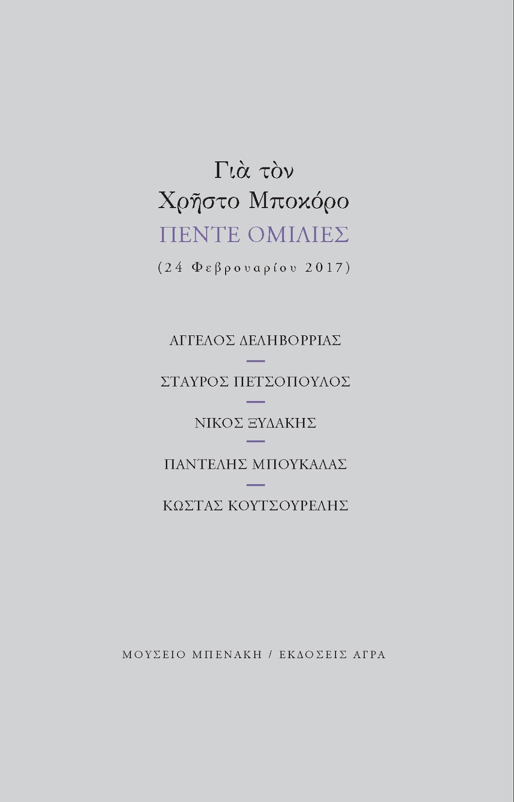Για τον Χρήστο Μποκόρο – Πέντε Ομιλίες (24 Φεβρουαρίου 2017), κείμενα: Αγγ. Δεληβοριάς, Στ. Πετσόπουλος, Ν. Ξυδάκης, Π. Μπουκάλας, Κ. Κουτσουρέλης, Χρ. Μποκόρος, επιμ.: Σταύρος Πετσόπουλος, Μουσείο Μπενάκη / Εκδόσεις Άγρα, Αθήνα 2017, σελ. 64. ISBN: 978-960-505-285-0