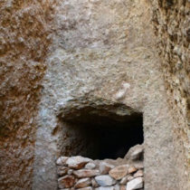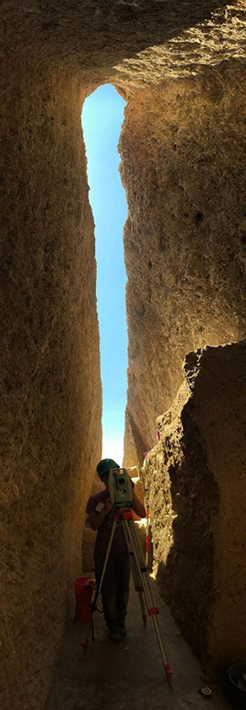 Η κατασκευή είναι μνημειώδης και μαρτυρεί την ιδιαίτερη φροντίδα που καταβλήθηκε για τη δημιουργία της. Στον νεκρικό θάλαμο οδηγεί λαξευτός δρόμος, μήκους 20 μ., ο οποίος απολήγει σε εντυπωσιακή αίθουσα επιφάνειας 42 τ.μ. Τις τέσσερις πλευρές της αίθουσας περιτρέχει λαξευτό θρανίο (πεζούλι) καλυμμένο με πηλοκονίαμα. Το αρχικό ύψος της οροφής, η οποία είχε σχήμα δίρριχτης στέγης, υπολογίζεται στα 3,5 μ. Ωστόσο, η αρχική στέγη άρχισε να καταρρέει ήδη από την αρχαιότητα, ίσως μάλιστα ακόμη και στη Μυκηναϊκή εποχή, δίνοντας στο εσωτερικό του θαλάμου σπηλαιώδη όψη, συνολικού ύψους 6,5 μ.