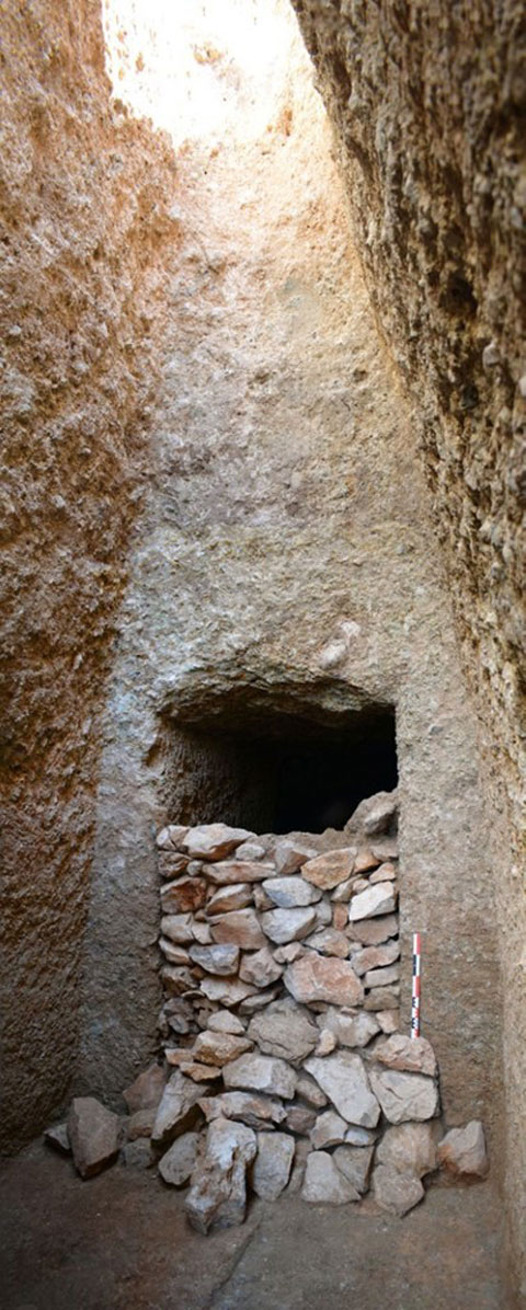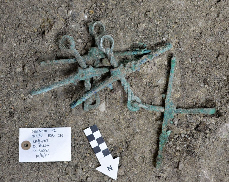 Η κατάρρευση της οροφής διατάραξε σε κάποιο βαθμό τη θέση του νεκρού και των αντικειμένων του, παράλληλα όμως κάλυψε και προστάτεψε το ταφικό στρώμα από μεταγενέστερες επεμβάσεις. Στο δάπεδο του θαλάμου βρέθηκε ένας άνδρας, 40-50 χρονών, τον οποίο συνόδευαν προσεκτικά επιλεγμένα αντικείμενα. Εντοπίστηκαν πάνω από δέκα επικασσιτερωμένα αγγεία, ζεύγος στομίδων (τμήματα από χαλινάρια αλόγων), εξαρτήματα τόξου, βέλη, περόνες, κοσμήματα από διάφορα υλικά, κτένια, ένας σφραγιδόλιθος και ένα σφραγιστικό δαχτυλίδι.