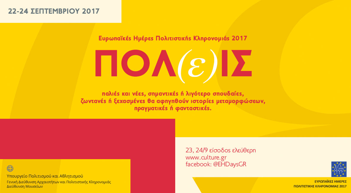 Στις 22-24 Σεπτεμβρίου το Υπουργείο Πολιτισμού και Αθλητισμού γιορτάζει τις Ευρωπαϊκές Ημέρες Πολιτιστικής Κληρονομιάς και μαζί τους τις πόλεις: παλιές και νέες, μεγάλες ή μικρότερες, σημαντικές ή λιγότερο σπουδαίες, ζωντανές ή ξεχασμένες. Αυτές θα αφηγηθούν μια διαφορετική ιστορία που ξεπερνά τα σύνορα της Ελλάδας, με σκοπό να μας προβληματίσουν για τη μεταμόρφωσή τους μέσα στο σύγχρονο κόσμο και την πορεία τους προς το μέλλον.