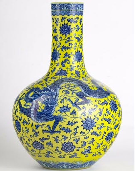 Σύμφωνα με τον κατάλογο της δημοπρασίας, το βάζο έχει ύψος 60 εκατοστά, απεικονίζει τρεις μπλε δράκους σε κίτρινο φόντο και χρονολογείται στις αρχές του 20ού αιώνα αλλά φέρει μια αμφίβολης γνησιότητας σφραγίδα της εποχής Σιανλόνγκ του 18ου αιώνα.