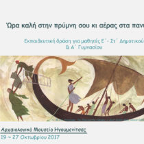 Συμμετέχοντας στην πανελλαδική εκστρατεία «Περιβάλλον και Πολιτισμός», που για τη διετία 2017-2018 είναι αφιερωμένη στο στοιχείο του αέρα με τίτλο «Πνοές Ανέμων», η Εφορεία Αρχαιοτήτων Θεσπρωτίας θα υλοποιήσει στο Αρχαιολογικό Μουσείο Ηγουμενίτσας την εκπαιδευτική δράση «’Ωρα καλή στην πρύμνη σου κι αέρας στα πανιά σου», για οργανωμένες σχολικές ομάδες Ε’-Στ’ Τάξεων Δημοτικού και Α’ Γυμνασίου, το διάστημα από 19 έως 27 Οκτωβρίου 2017.