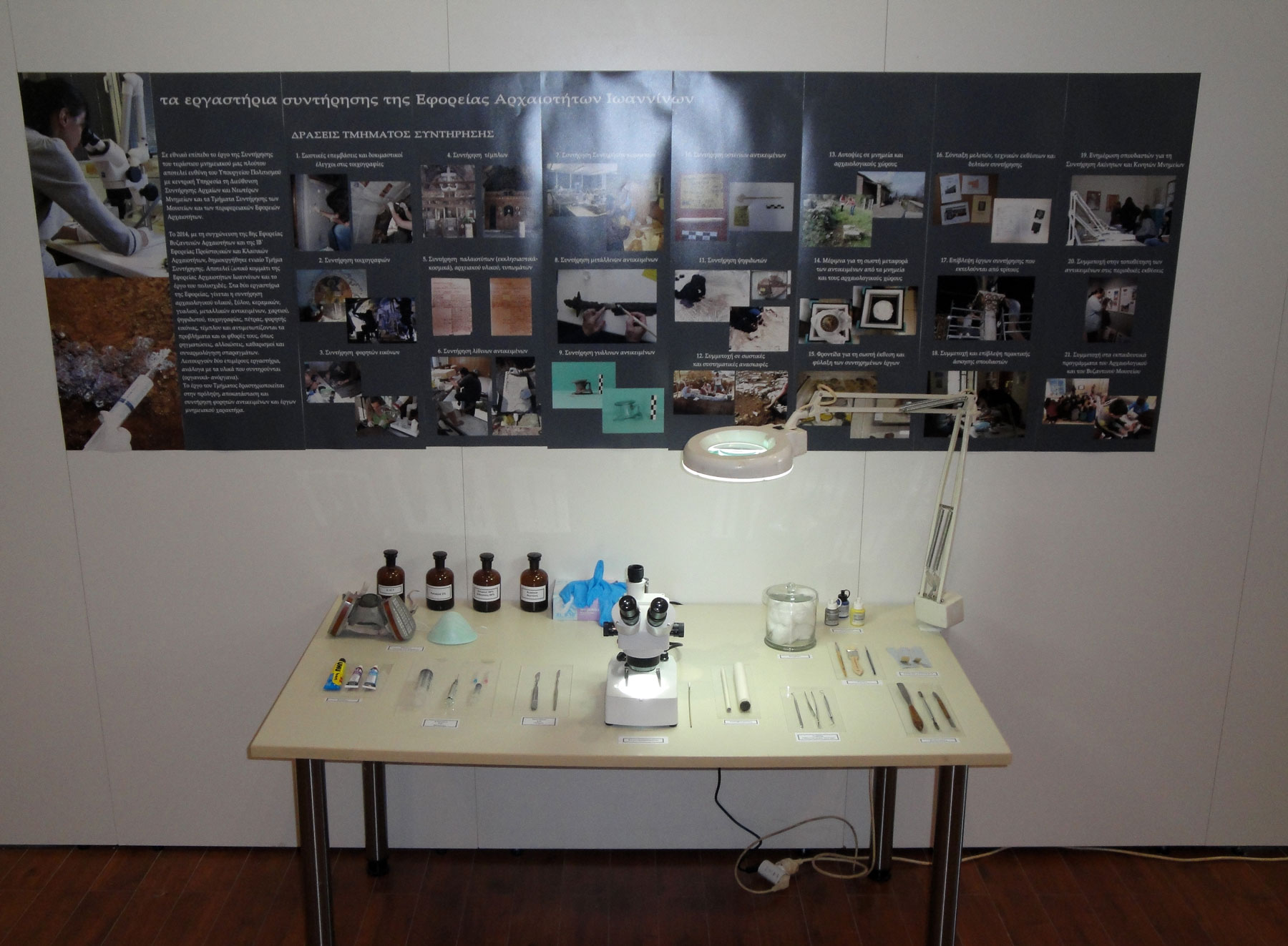Η έκθεση, που πραγματοποιείται στo πλαίσιο των εκδηλώσεων «Ευρωπαϊκές Ημέρες Πολιτιστικής κληρονομιάς», παρουσιάζει για πρώτη φορά, στο ευρύ κοινό, τον αθέατο κόσμο των Εργαστηρίων Συντήρησης της Εφορείας Αρχαιοτήτων Ιωαννίνων, μέσα από μια σειρά διαδικασιών και ενεργειών, που πραγματοποιούνται από το εξειδικευμένο προσωπικό, για τη συντήρηση–αποκατάσταση των έργων τέχνης.
