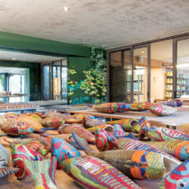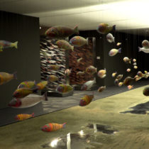»Με τόλμη και φαντασία έχει δουλέψει με έντονα χρώματα, που αντανακλούν τη λαμπερή ποιότητα των εναλλαγών του φωτός, εστιάζοντας την προσοχή της στην αρμονική και ισορροπημένη ανάπτυξη της εγκατάστασης με τις οριζόντιες κατευθύνσεις που δημιουργεί μια ξεχωριστή πρωτόφαντη ατμόσφαιρα.