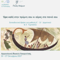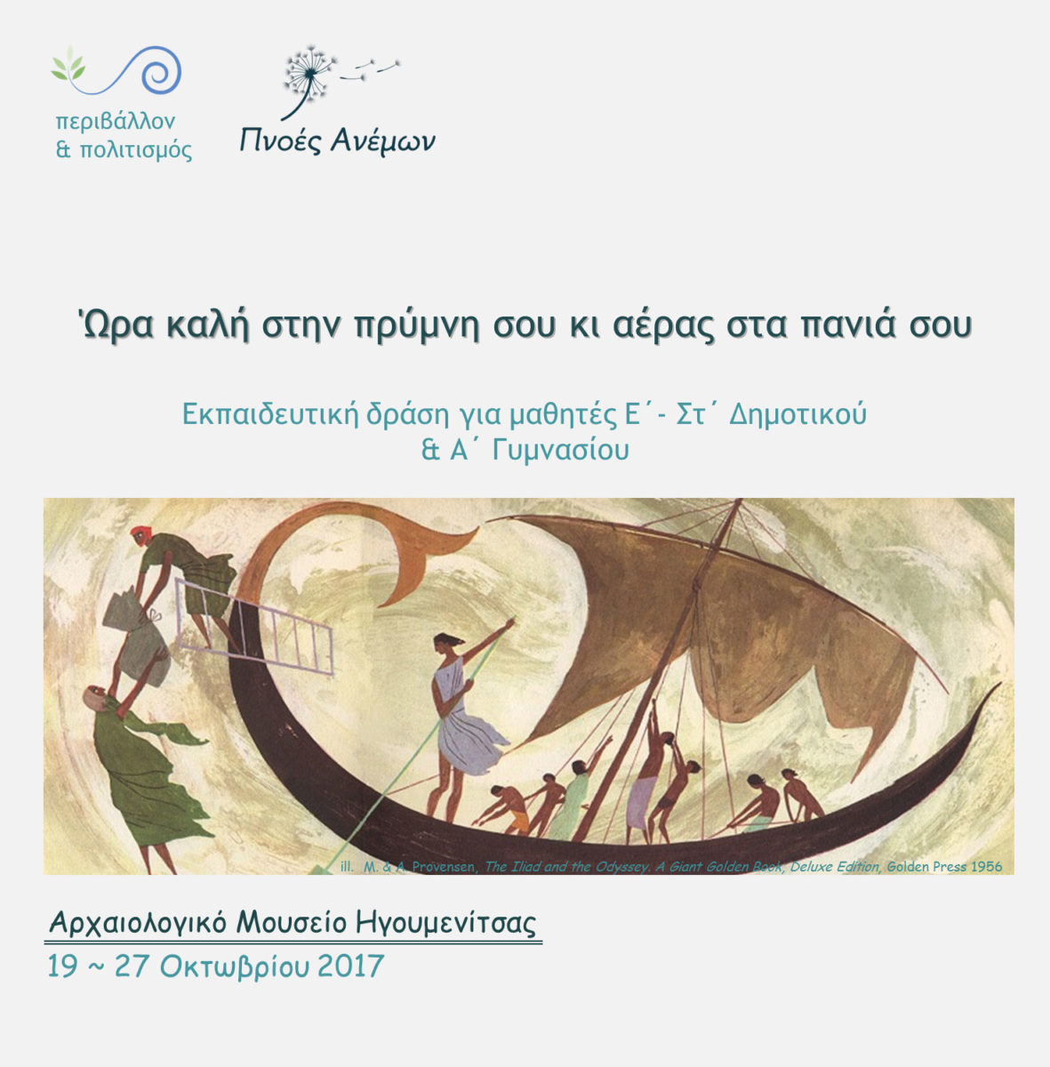 Συμμετέχοντας στην πανελλαδική εκστρατεία «Περιβάλλον και Πολιτισμός», που για τη διετία 2017-2018 είναι αφιερωμένη στο στοιχείο του αέρα με τίτλο «Πνοές Ανέμων», η Εφορεία Αρχαιοτήτων Θεσπρωτίας θα υλοποιήσει στο Αρχαιολογικό Μουσείο Ηγουμενίτσας την εκπαιδευτική δράση «’Ωρα καλή στην πρύμνη σου κι αέρας στα πανιά σου», για οργανωμένες σχολικές ομάδες Ε’-Στ’ Τάξεων Δημοτικού και Α’ Γυμνασίου, το διάστημα από 19 έως 27 Οκτωβρίου 2017.