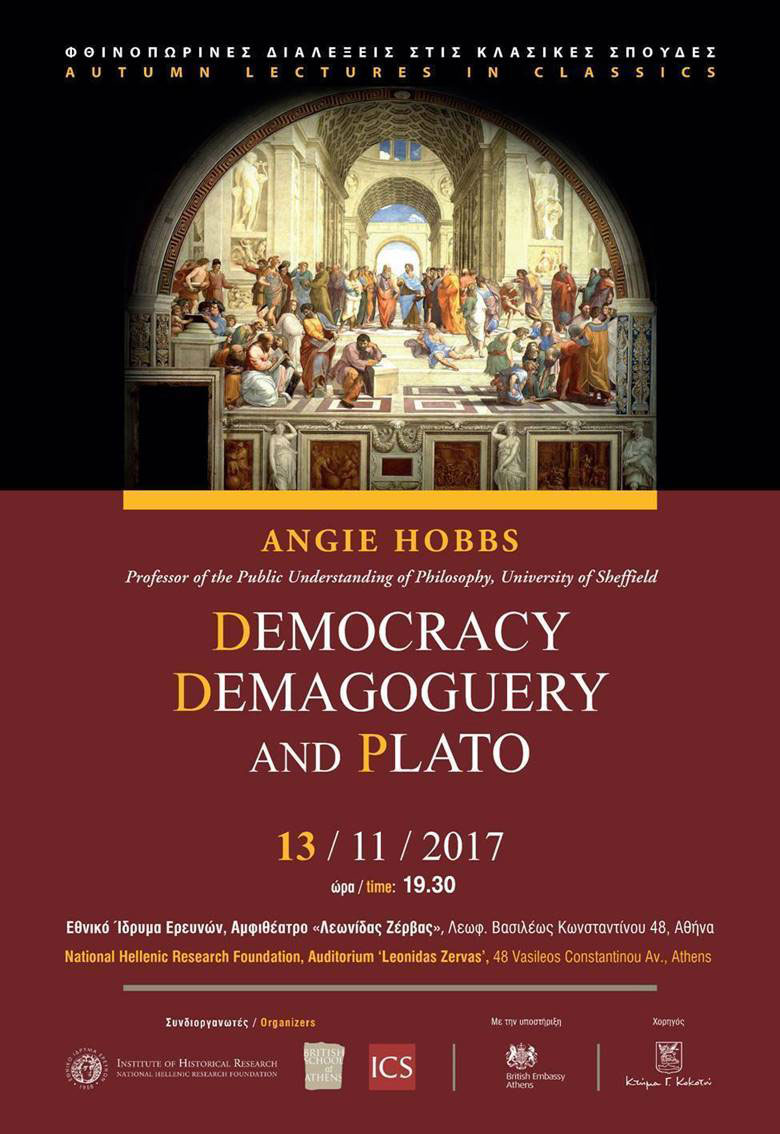 «Η Δημοκρατία, η Δημαγωγία και ο Πλάτων» είναι το θέμα ομιλίας της Angie Hobbs, καθηγήτριας της Κατανόησης της Φιλοσοφίας από το Κοινό στο Πανεπιστήμιο του Sheffield, που θα πραγματοποιηθεί τη Δευτέρα 13 Νοεμβρίου 2017, και ώρα 19:30, στο Εθνικό Ίδρυμα Ερευνών (Λεωφ. Βασιλέως Κωνσταντίνου 48, Aθήνα).