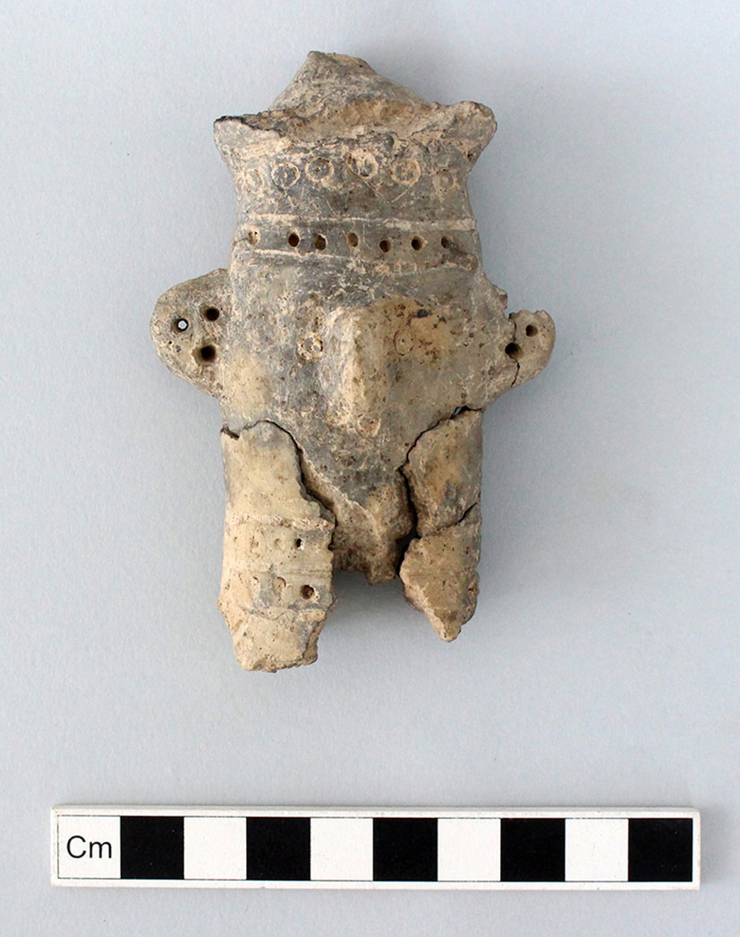 Κοντά στον τοίχο που φαίνεται στο πάνω αριστερό μέρος της εικόνας 2, βρέθηκαν και άλλα κατάλοιπα τοίχου που κατέρρευσε. Όταν αυτά αναιρέθηκαν, αποκαλύφθηκε μια αλληλουχία δύο δαπέδων. Πάνω από το ανώτερο δάπεδο βρέθηκε το πάνω μέρος ενός πήλινου ειδωλίου. Πρόκειται για ασυνήθιστου τύπου ειδώλιο, πιθανότατα της Μέσης Εποχής του Χαλκού. Τα πολύ λίγα ειδώλια αυτής της περιόδου που είναι γνωστά παρουσιάζουν ποικιλία χαρακτηριστικών. Η ρυθμός διακόσμησης αυτού του ειδωλίου, ιθαγενής στην Κισσόνεργα, αποτελείται από εμπίεστους κύκλους με στιγμή στο κέντρο και παράλληλες ευθείες που περιβάλλουν σειρά στιγμών. Η μορφή έχει τρυπημένα αυτιά και φέρει ένα σύνθετο κάλυμμα στο κεφάλι.