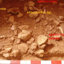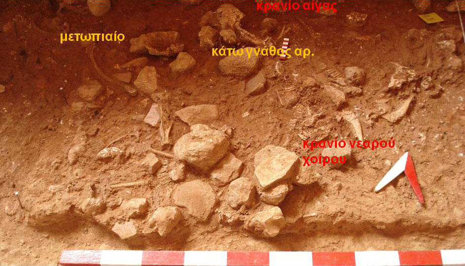 «Στο ανατολικό τμήμα, κάτω από τους τοποθετημένους λίθους, αποκαλύφθηκε αυτό που αναμέναμε: το κρανίο της νεαρής κοπέλας ανάμεσα σε κρανία ζώων, όχι όμως ακέραιο. Ήταν διαμελισμένο, όπως όλα τα υπόλοιπα οστά. Ανοιγμένο ακριβώς από τις ραφές, αφού προηγήθηκε κόψιμο με ξίφος στο δεξί βρεγματικό και το ινιακό οστό, και διασκορπισμένο ανάμεσα σε κρανία ζώων (τουλάχιστον δύο αιγών και ενός χοίρου). Είναι αλήθεια. Το ανθρώπινο κρανίο είχε διαμελιστεί, ίσως και το υπόλοιπο σώμα και κατά τον ίδιο τρόπο με των ζώων. Τα δύο βρεγματικά οστά, το ινιακό και το μετωπιαίο που έχουν έρθει στο φως δεν είναι κομματιασμένα, αλλά ανοιγμένα από τις φυσικές τους ραφές και διασκορπισμένα. Κοντά τους και η δεξιά κάτω σιαγόνα. Η εικόνα σοκάρει» τόνισε στη διάρκεια της εισήγησής της στην κατάμεστη αίθουσα «Μανόλης Ανδρόνικος» του Μουσείου η ομιλήτρια.