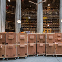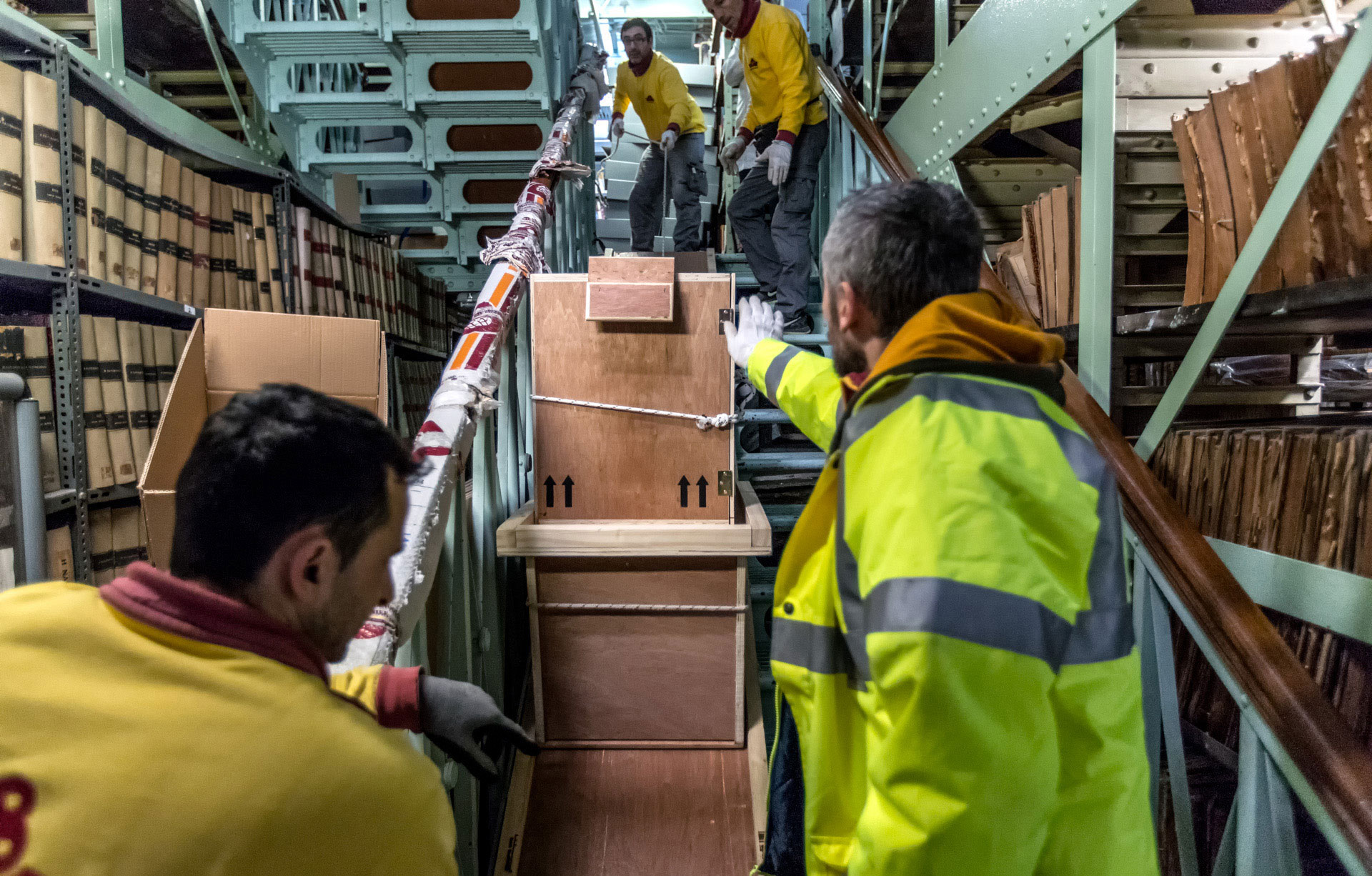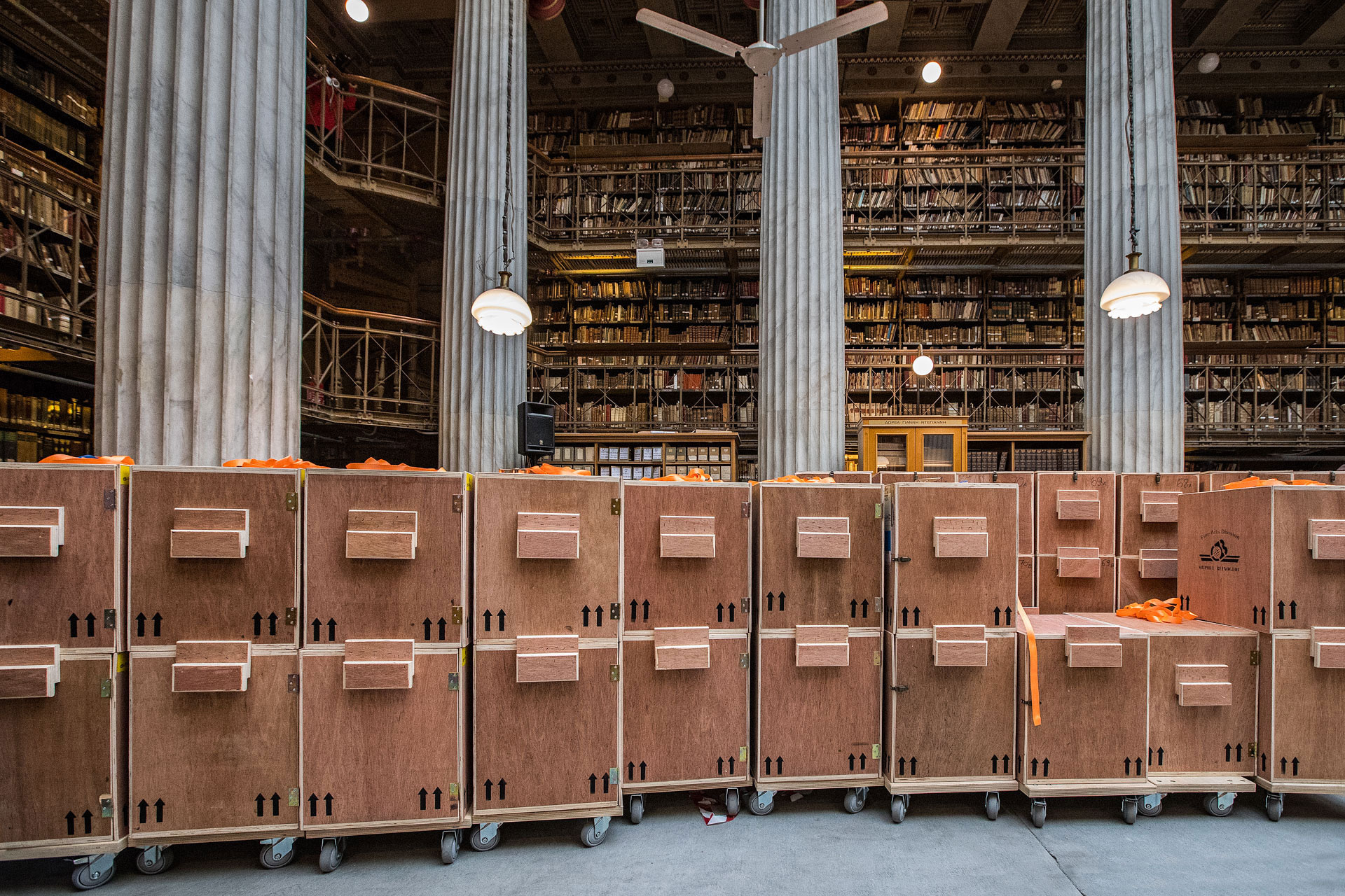 Μέσα στο γυάλινο κτίριο του Ρέντσο Πιάνο, το φυσικό φως διαχέεται στα πολύχρωμα έπιπλα, στον Πύργο Βιβλίων και στα αναγνωστήρια έως τον σκληρό πυρήνα του κτιρίου, την Ερευνητική Εθνική Βιβλιοθήκη. Κι ανάμεσα στους αναγνώστες, μια κυψέλη ανθρώπων δουλεύει αθόρυβα για να ολοκληρώσει το πολύπλοκο έργο της μετεγκατάστασης που ξεκίνησε πριν από τρία χρόνια και φτάνει τώρα στη φάση της μετακόμισης.