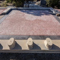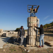 Παράλληλα ξεκίνησε η κατασκευή των περίπου 7.000 λίθινων πλίνθων, που έχουν μήκος γύρω στο ένα μέτρο, ύψος μισό και πλάτος 60 με 70 εκατοστών, οι οποίοι θα χρησιμοποιηθούν μαζί με τους αρχαίους που διατηρήθηκαν, για την ανακατασκευή του τεράστιου αναλήμματος, επάνω στο οποίο εδράζεται το μνημείο. Οι επιφάνειες όλων αυτών των λίθων διαμορφώνονται από τους τεχνίτες με το χέρι και τα εργαλεία είναι αντίστοιχα με αυτά που χρησιμοποιούνταν στην αρχαιότητα.