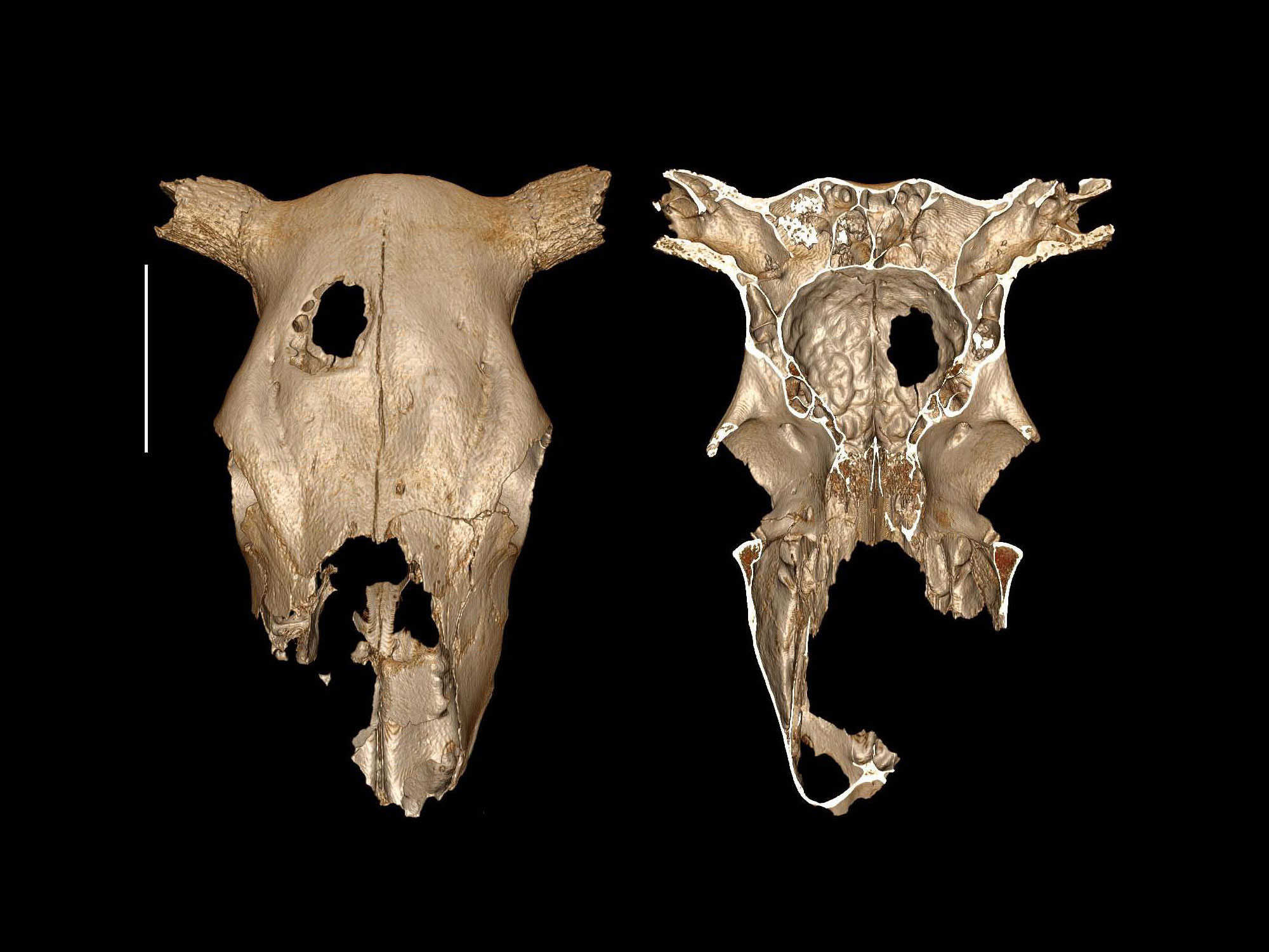 Οι ερευνητές, με επικεφαλής τον Φερνάντο Ραμίρεζ Ρότσι του Εθνικού Κέντρου Επιστημονικών Ερευνών (CNRS) της Γαλλίας, που έκαναν τη σχετική δημοσίευση στο περιοδικό «Scientific Reports», βρήκαν το κρανίο στη δυτική Γαλλία, 40 χιλιόμετρα από την ακτή του Ατλαντικού. Το κρανίο φέρει μία σχεδόν τετράγωνη τρύπα στο οστό του δεξιού πρόσθιου λοβού με διαστάσεις 6,5×4,6 εκ. και μήκος 4 εκ. Η ανάλυση της τρύπας έδειξε ότι δεν είχε προέλθει από χτύπημα, π.χ. από μετωπική σύγκρουση με άλλη αγελάδα, αλλά από κάποιο άγνωστο όργανο τρυπανισμού.