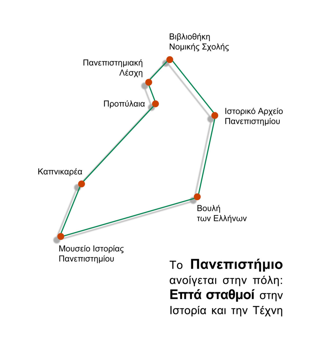 Τι συνδέει την Καπνικαρέα με τα Προπύλαια; Ποια τεκμήρια ιστορίας μπορεί να δει κανείς στο Ιστορικό Αρχείο και ποια στο Μουσείο Ιστορίας του Πανεπιστημίου; Έχετε επισκεφτεί τη Βιβλιοθήκη της Νομικής και το κτίριο του Παλαιού Χημείου; Πόσες φορές έχετε περάσει μπροστά από τη Φοιτητική Λέσχη χωρίς να το ξέρετε; Γνωρίζετε την ομάδα «Δίκαιο και Τέχνη» και το μουσικό σύνολο «Μέλος»;