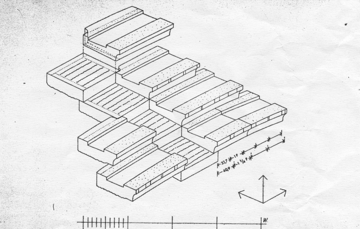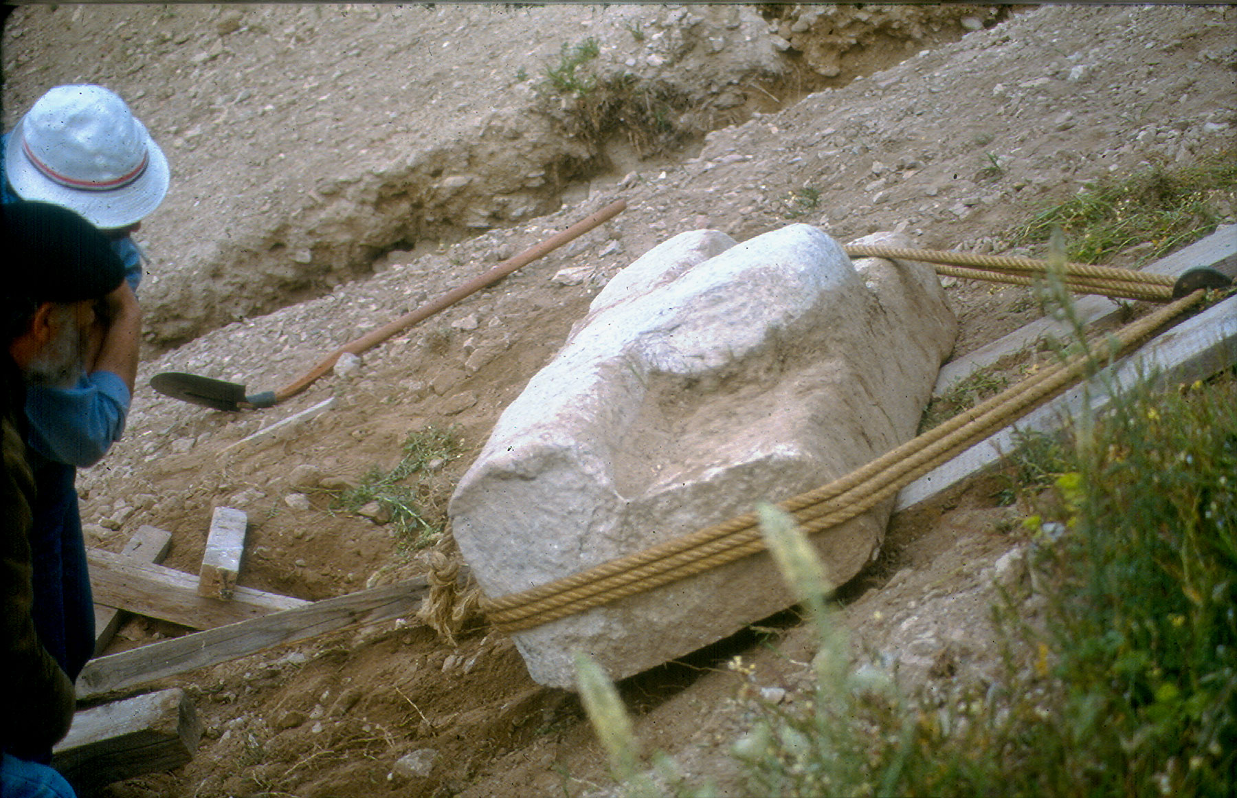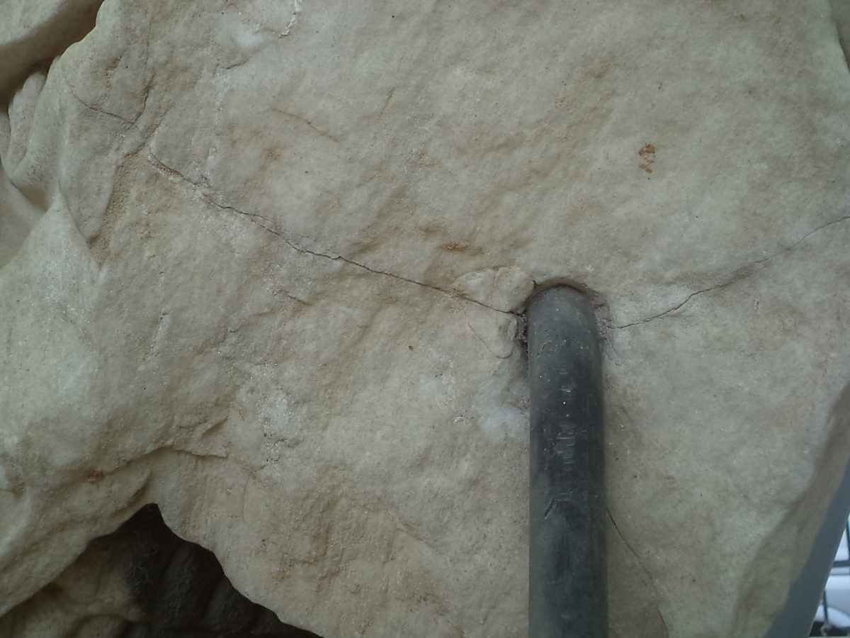 Παράλληλα με την κατασκευή του στεγάστρου άρχισε και η μεταφορά των διάσπαρτων αγαλμάτων και γενικότερα μαρμάρινων σπαραγμάτων, που έπρεπε να προστατευτούν. Το έργο τοποθέτησης των αγαλμάτων σε τσιμεντένιες βάσεις είχε ξεκινήσει από τους Wurster και Κορρέ, καθώς και τους γλύπτες Λ. Βαλάκα και Α. Φανακίδη (εικ. 37). Καθώς επισημάνθηκε ότι ένα άγαλμα στημένο στη βάση του είχε ρηγματωθεί σε όλο του το ύψος (εικ. 38, 39), τροποποιήθηκε η μέθοδος στήριξης. Γνωρίζοντας από την πρακτική των αρχαίων ότι η ολιγόλεπτη θερμοκρασία πήξεως του μολύβδου δεν προκαλεί ασβεστοποίηση του μαρμάρου, χρησιμοποιήθηκε μολυβδοχόηση για τη συγκόλληση των ράβδων ανοξείδωτου χάλυβα στο ψαχνό των αγαλμάτων, για να αποσοβηθούν οι οποιεσδήποτε δυνάμεις θα μπορούσαν να ασκηθούν. Συγκεκριμένα, όσα αγάλματα δεν είχαν τοποθετηθεί στις βάσεις τους από τον Wurster αναστράφηκαν, ανοίχτηκε στο κάτω μέρος τους τρύπα βάθους περίπου 50 εκ., και τοποθετήθηκε η ράβδος η οποία κρατήθηκε ώστε να αφήνει κενό γύρω της. Το κενό πληρώθηκε στη συνέχεια με τον τηγμένο μόλυβδο για να ακολουθήσει η επαναφορά των αγαλμάτων στην κανονική τους θέση και το τμήμα της ράβδου που εξείχε να χωθεί στην τσιμεντένια βάση (σημ. 40).
